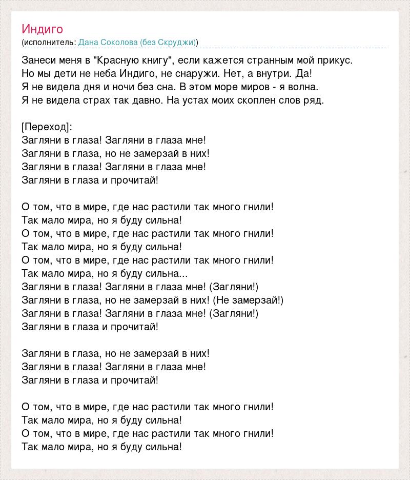 Занеси меня в "Красную книгу", если кажется странным мой прикус. Но мы дети не неба Индиго, не снаружи. Нет, а внутри. Да! Я не видела дня и ночи без сна. В этом море миров - я волна. Я не видела страх так давно. На устах моих скоплен слов ряд. [Переход]: Загляни в глаза! Загляни в глаза мне! Загляни в глаза, но не замерзай в них! Загляни в глаза! Загляни в глаза мне! Загляни в глаза и прочитай! О том, что в мире, где нас растили так много гнили! Так мало мира, но я буду сильна! О том, что в мире, где нас растили так много гнили! Так мало мира, но я буду сильна! О том, что в мире, где нас растили так много гнили! Так мало мира, но я буду сильна... Загляни в глаза! Загляни в глаза мне! (Загляни!) Загляни в глаза, но не замерзай в них! (Не замерзай!) Загляни в глаза! Загляни в глаза мне! (Загляни!) Загляни в глаза и прочитай! Загляни в глаза, но не замерзай в них! Загляни в глаза! Загляни в глаза мне! Загляни в глаза и прочитай! О том, что в мире, где нас растили так много гнили! Так мало мира, но я буду сильна! О том, что в мире, где нас растили так много гнили! Так мало мира, но я буду сильна!