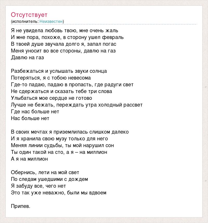 Я не увидела любовь твою, мне очень жаль И мне пора, похоже, в сторону ушел февраль В твоей душе звучала долго я, запал погас Меня уносит во все стороны, давлю на газ Давлю на газ Разбежаться и услышать звуки солнца Потеряться, я с тобою невесома Где-то падаю, падаю в пропасть, где радуги свет Не сдержаться и сказать тебе три слова Улыбаться мое сердце не готово Лучше не бежать, переждать утра холодный рассвет Где нас больше нет Нас больше нет В своих мечтах я приземлилась слишком далеко И я хранила свою музу только для него Меняя линии судьбы, ты мой нарушил сон Ты один такой на сто, а я – на миллион А я на миллион Обернись, лети на мой свет По следам ушедшими с дождем Я забуду все, чего нет Это так уже неважно, были мы вдвоем Припев.