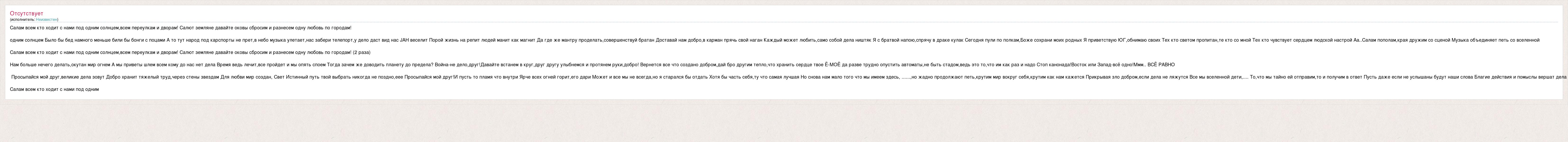 Салам всем кто ходит с нами под одним солнцем,всем переулкам и дворам! Салют земляне давайте оковы сбросим и разнесем одну любовь по городам! одним солнцем Было бы бед намного меньше били бы бонги с поцами А то тут народ под карспорты не прет,в небо музыка улетает,нас забери телепорт,у дело даст вид нас JAH веселит Порой жизнь на репит людей манит как магнит Да где же мантру проделать,совершенствуй братан Доставай нам добро,в карман прячь свой наган Каждый может любить,само собой дела ништяк Я с братвой напою,спрячу в драке кулак Сегодня пули по полкам,Боже сохрани моих родных Я приветствую ЮГ,обнимаю своих Тех кто светом пропитан,те кто со мной Тех кто чувствует сердцем людской настрой Аа..Салам пополам,края дружим со сценой Музыка объединяет петь со вселенной Салам всем кто ходит с нами под одним солнцем,всем переулкам и дворам! Салют земляне давайте оковы сбросим и разнесем одну любовь по городам! (2 раза) Нам больше нечего делать,окутан мир огнем А мы приветы шлем всем кому до нас нет дела Время ведь лечит,все пройдет и мы опять споем Тогда зачем же доводить планету до предела? Война-не дело,друг!Давайте встанем в круг,друг другу улыбнемся и протянем руки,добро! Вернется все что создано добром,дай бро другим тепло,что хранить сердце твое Ё-МОЁ да разве трудно опустить автоматы,не быть стадом,ведь это то,что им как раз и надо Стоп канонада!Восток или Запад-всё одно!Ммм.. ВСЁ РАВНО Просыпайся мой друг,великие дела зовут Добро хранит тяжелый труд,через стены звездам Для любви мир создан, Свет Истинный путь твой выбрать никогда не поздно,еее Просыпайся мой друг!И пусть то пламя что внутри Ярче всех огней горит,его дари Может и все мы не всегда,но я старался бы отдать Хотя бы часть себя,ту что самая лучшая Но снова нам мало того что мы имеем здесь, ......,но жадно продолжают петь,крутим мир вокруг себя,крутим как нам кажется Прикрывая зло добром,если дела не ляжутся Все мы вселенной дети,.... То,что мы тайно ей отправим,то и получим в ответ Пусть даже если не услышаны будут наши слова Благие действия и помыслы вершат дела Салам всем кто ходит с нами под одним