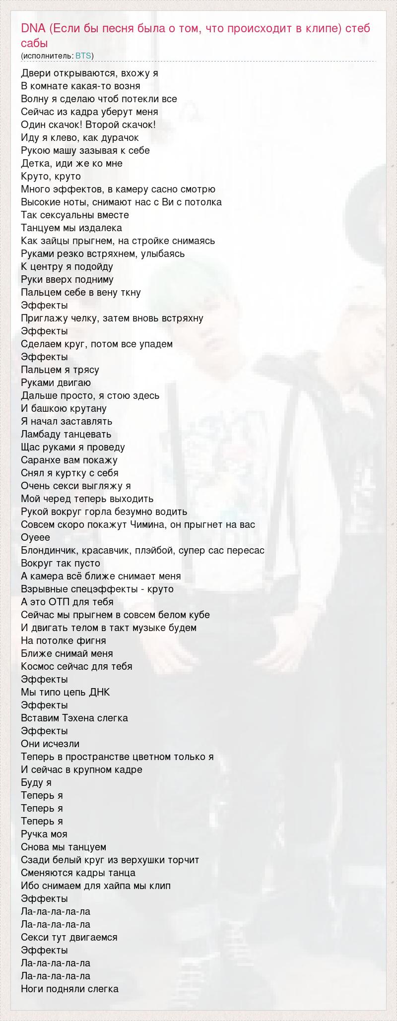 Двери открываются, вхожу я В комнате какая-то возня Волну я сделаю чтоб потекли все Сейчас из кадра уберут меня Один скачок! Второй скачок! Иду я клево, как дурачок Рукою машу зазывая к себе Детка, иди же ко мне Круто, круто Много эффектов, в камеру сасно смотрю Высокие ноты, снимают нас с Ви с потолка Так сексуальны вместе Танцуем мы издалека Как зайцы прыгнем, на стройке снимаясь Руками резко встряхнем, улыбаясь К центру я подойду Руки вверх подниму Пальцем себе в вену ткну Эффекты Приглажу челку, затем вновь встряхну Эффекты Сделаем круг, потом все упадем Эффекты Пальцем я трясу Руками двигаю Дальше просто, я стою здесь И башкою крутану Я начал заставлять Ламбаду танцевать Щас руками я проведу Саранхе вам покажу Снял я куртку с себя Очень секси выгляжу я Мой черед теперь выходить Рукой вокруг горла безумно водить Совсем скоро покажут Чимина, он прыгнет на вас Оуеее Блондинчик, красавчик, плэйбой, супер сас пересас Вокруг так пусто А камера всё ближе снимает меня Взрывные спецэффекты - круто А это ОТП для тебя Сейчас мы прыгнем в совсем белом кубе И двигать телом в такт музыке будем На потолке фигня Ближе снимай меня Космос сейчас для тебя Эффекты Мы типо цепь ДНК Эффекты Вставим Тэхена слегка Эффекты Они исчезли Теперь в пространстве цветном только я И сейчас в крупном кадре Буду я Теперь я Теперь я Теперь я Ручка моя Снова мы танцуем Сзади белый круг из верхушки торчит Сменяются кадры танца Ибо снимаем для хайпа мы клип Эффекты Ла-ла-ла-ла-ла Ла-ла-ла-ла-ла Секси тут двигаемся Эффекты Ла-ла-ла-ла-ла Ла-ла-ла-ла-ла Ноги подняли слегка