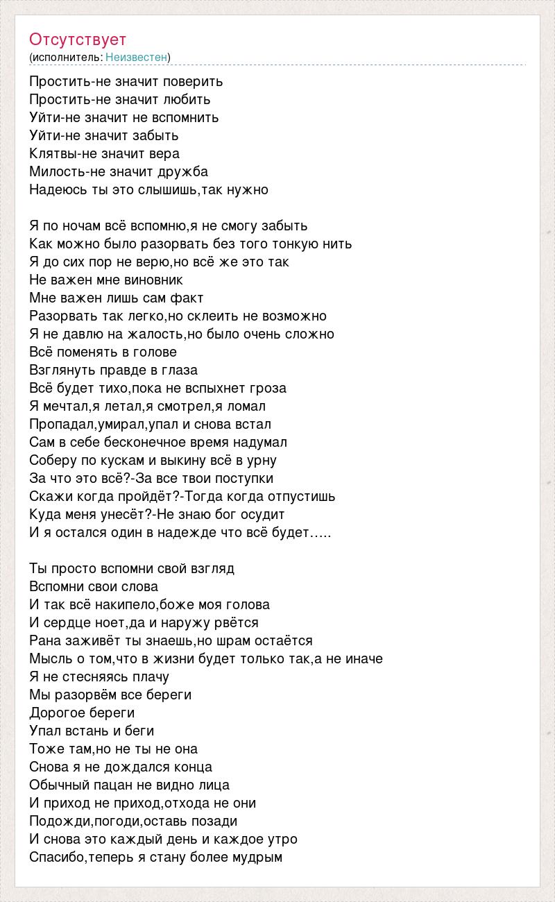 Простить-не значит поверить Простить-не значит любить Уйти-не значит не вспомнить Уйти-не значит забыть Клятвы-не значит вера Милость-не значит дружба Надеюсь ты это слышишь,так нужно Я по ночам всё вспомню,я не смогу забыть Как можно было разорвать без того тонкую нить Я до сих пор не верю,но всё же это так Не важен мне виновник Мне важен лишь сам факт Разорвать так легко,но склеить не возможно Я не давлю на жалость,но было очень сложно Всё поменять в голове Взглянуть правде в глаза Всё будет тихо,пока не вспыхнет гроза Я мечтал,я летал,я смотрел,я ломал Пропадал,умирал,упал и снова встал Сам в себе бесконечное время надумал Соберу по кускам и выкину всё в урну За что это всё?-За все твои поступки Скажи когда пройдёт?-Тогда когда отпустишь Куда меня унесёт?-Не знаю бог осудит И я остался один в надежде что всё будет….. Ты просто вспомни свой взгляд Вспомни свои слова И так всё накипело,боже моя голова И сердце ноет,да и наружу рвётся Рана заживёт ты знаешь,но шрам остаётся Мысль о том,что в жизни будет только так,а не иначе Я не стесняясь плачу Мы разорвём все береги Дорогое береги Упал встань и беги Тоже там,но не ты не она Снова я не дождался конца Обычный пацан не видно лица И приход не приход,отхода не они Подожди,погоди,оставь позади И снова это каждый день и каждое утро Спасибо,теперь я стану более мудрым