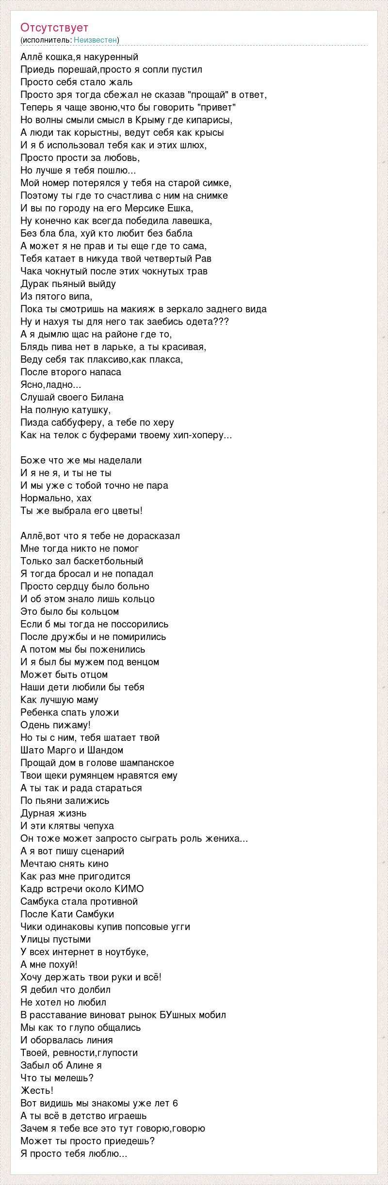 Аллё кошка,я накуренный Приедь порешай,просто я сопли пустил Просто себя стало жаль Просто зря тогда сбежал не сказав "прощай" в ответ, Теперь я чаще звоню,что бы говорить "привет" Но волны смыли смысл в Крыму где кипарисы, А люди так корыстны, ведут себя как крысы И я б использовал тебя как и этих шлюх, Просто прости за любовь, Но лучше я тебя пошлю... Мой номер потерялся у тебя на старой симке, Поэтому ты где то счастлива с ним на снимке И вы по городу на его Мерсике Ешка, Ну конечно как всегда победила лавешка, Без бла бла, хуй кто любит без бабла А может я не прав и ты еще где то сама, Тебя катает в никуда твой четвертый Рав Чака чокнутый после этих чокнутых трав Дурак пьяный выйду Из пятого випа, Пока ты смотришь на макияж в зеркало заднего вида Ну и нахуя ты для него так заебись одета??? А я дымлю щас на районе где то, Блядь пива нет в ларьке, а ты красивая, Веду себя так плаксиво,как плакса, После второго напаса Ясно,ладно... Слушай своего Билана На полную катушку, Пизда саббуферу, а тебе по херу Как на телок с буферами твоему хип-хоперу... Боже что же мы наделали И я не я, и ты не ты И мы уже с тобой точно не пара Нормально, хах Ты же выбрала его цветы! Аллё,вот что я тебе не дорасказал Мне тогда никто не помог Только зал баскетбольный Я тогда бросал и не попадал Просто сердцу было больно И об этом знало лишь кольцо Это было бы кольцом Если б мы тогда не поссорились После дружбы и не помирились А потом мы бы поженились И я был бы мужем под венцом Может быть отцом Наши дети любили бы тебя Как лучшую маму Ребенка спать уложи Одень пижаму! Но ты с ним, тебя шатает твой Шато Марго и Шандом Прощай дом в голове шампанское Твои щеки румянцем нравятся ему А ты так и рада стараться По пьяни залижись Дурная жизнь И эти клятвы чепуха Он тоже может запросто сыграть роль жениха... А я вот пишу сценарий Мечтаю снять кино Как раз мне пригодится Кадр встречи около КИМО Самбука стала противной После Кати Самбуки Чики одинаковы купив попсовые угги Улицы пустыми У всех интернет в ноутбуке, А мне похуй! Хочу держать твои руки и всё! Я дебил что долбил Не хотел но любил В расставание виноват рынок БУшных мобил Мы как то глупо общались И оборвалась линия Твоей, ревности,глупости Забыл об Алине я Что ты мелешь? Жесть! Вот видишь мы знакомы уже лет 6 А ты всё в детство играешь Зачем я тебе все это тут говорю,говорю Может ты просто приедешь? Я просто тебя люблю...