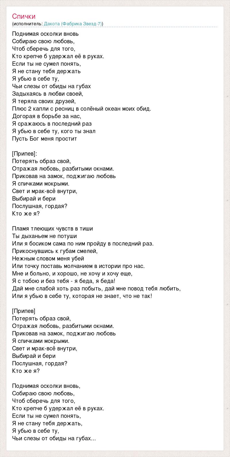 Поднимая осколки вновь Собираю свою любовь, Чтоб сберечь для того, Кто крепче б удержал её в руках. Если ты не сумел понять, Я не стану тебя держать Я убью в себе ту, Чьи слезы от обиды на губах Задыхаясь в любви своей, Я теряла своих друзей, Плюс 2 капли с ресниц в солёный океан моих обид. Догорая в борьбе за нас, Я сражаюсь в последний раз Я убью в себе ту, кого ты знал Пусть Бог меня простит [Припев]: Потерять образ свой, Отражая любовь, разбитыми окнами. Приковав на замок, поджигаю любовь Я спичками мокрыми. Свет и мрак-всё внутри, Выбирай и бери Послушная, гордая? Кто же я? Пламя тлеющих чувств в тиши Ты дыханьем не потуши Или я босиком сама по ним пройду в последний раз. Прикоснувшись к губам смелей, Нежным словом меня убей Или точку поставь молчанием в истории про нас. Мне и больно, и хорошо, не хочу и хочу еще, Я с тобою и без тебя - я беда, я беда! Дай мне слабой хоть раз побыть, дай мне повод тебя любить, Или я убью в себе ту, которая не знает, что не так! [Припев] Потерять образ свой, Отражая любовь, разбитыми окнами. Приковав на замок, поджигаю любовь Я спичками мокрыми. Свет и мрак-всё внутри, Выбирай и бери Послушная, гордая? Кто же я? Поднимая осколки вновь, Собираю свою любовь, Чтоб сберечь для того, Кто крепче б удержал её в руках. Если ты не сумел понять, Я не стану тебя держать, Я убью в себе ту, Чьи слезы от обиды на губах...