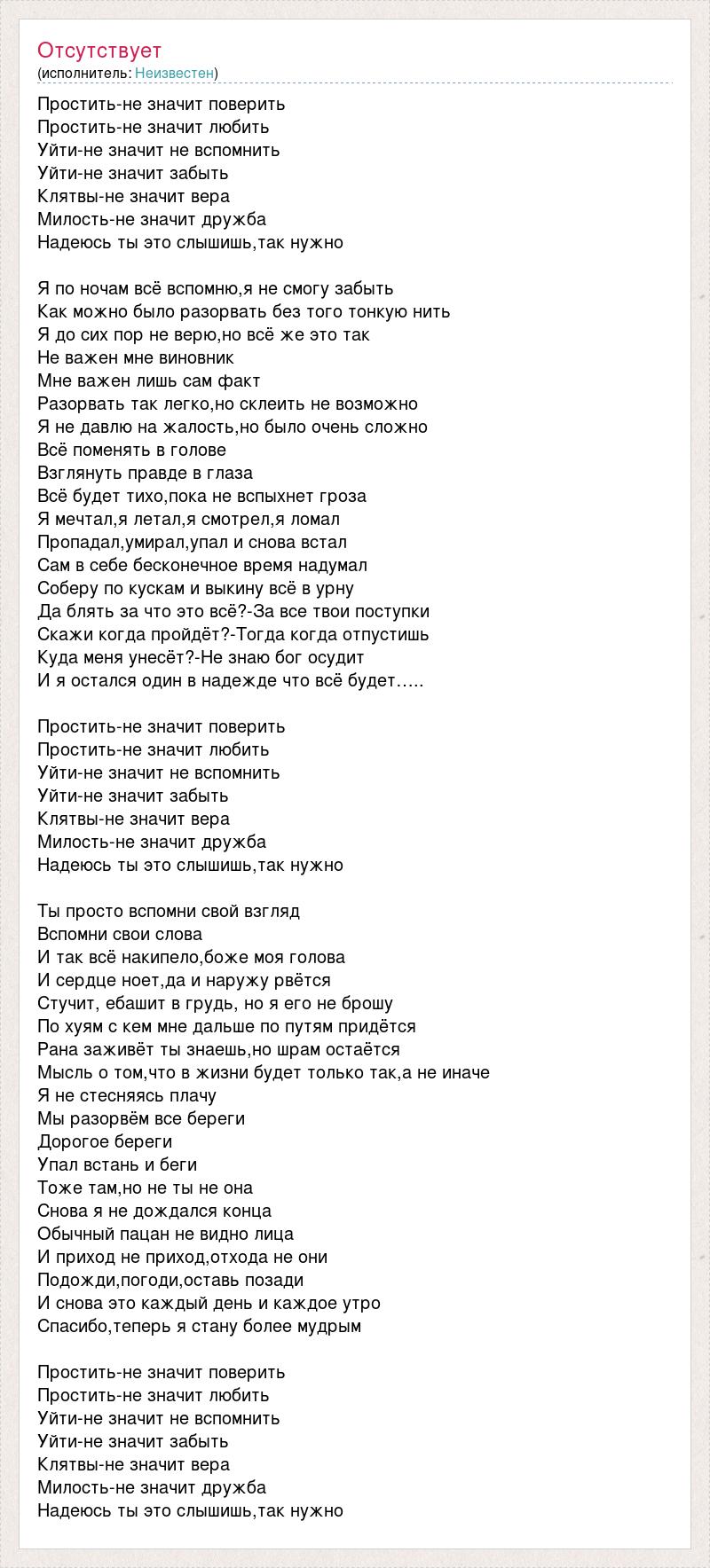 Простить-не значит поверить Простить-не значит любить Уйти-не значит не вспомнить Уйти-не значит забыть Клятвы-не значит вера Милость-не значит дружба Надеюсь ты это слышишь,так нужно Я по ночам всё вспомню,я не смогу забыть Как можно было разорвать без того тонкую нить Я до сих пор не верю,но всё же это так Не важен мне виновник Мне важен лишь сам факт Разорвать так легко,но склеить не возможно Я не давлю на жалость,но было очень сложно Всё поменять в голове Взглянуть правде в глаза Всё будет тихо,пока не вспыхнет гроза Я мечтал,я летал,я смотрел,я ломал Пропадал,умирал,упал и снова встал Сам в себе бесконечное время надумал Соберу по кускам и выкину всё в урну Да блять за что это всё?-За все твои поступки Скажи когда пройдёт?-Тогда когда отпустишь Куда меня унесёт?-Не знаю бог осудит И я остался один в надежде что всё будет….. Простить-не значит поверить Простить-не значит любить Уйти-не значит не вспомнить Уйти-не значит забыть Клятвы-не значит вера Милость-не значит дружба Надеюсь ты это слышишь,так нужно Ты просто вспомни свой взгляд Вспомни свои слова И так всё накипело,боже моя голова И сердце ноет,да и наружу рвётся Стучит, ебашит в грудь, но я его не брошу По хуям с кем мне дальше по путям придётся Рана заживёт ты знаешь,но шрам остаётся Мысль о том,что в жизни будет только так,а не иначе Я не стесняясь плачу Мы разорвём все береги Дорогое береги Упал встань и беги Тоже там,но не ты не она Снова я не дождался конца Обычный пацан не видно лица И приход не приход,отхода не они Подожди,погоди,оставь позади И снова это каждый день и каждое утро Спасибо,теперь я стану более мудрым Простить-не значит поверить Простить-не значит любить Уйти-не значит не вспомнить Уйти-не значит забыть Клятвы-не значит вера Милость-не значит дружба Надеюсь ты это слышишь,так нужно