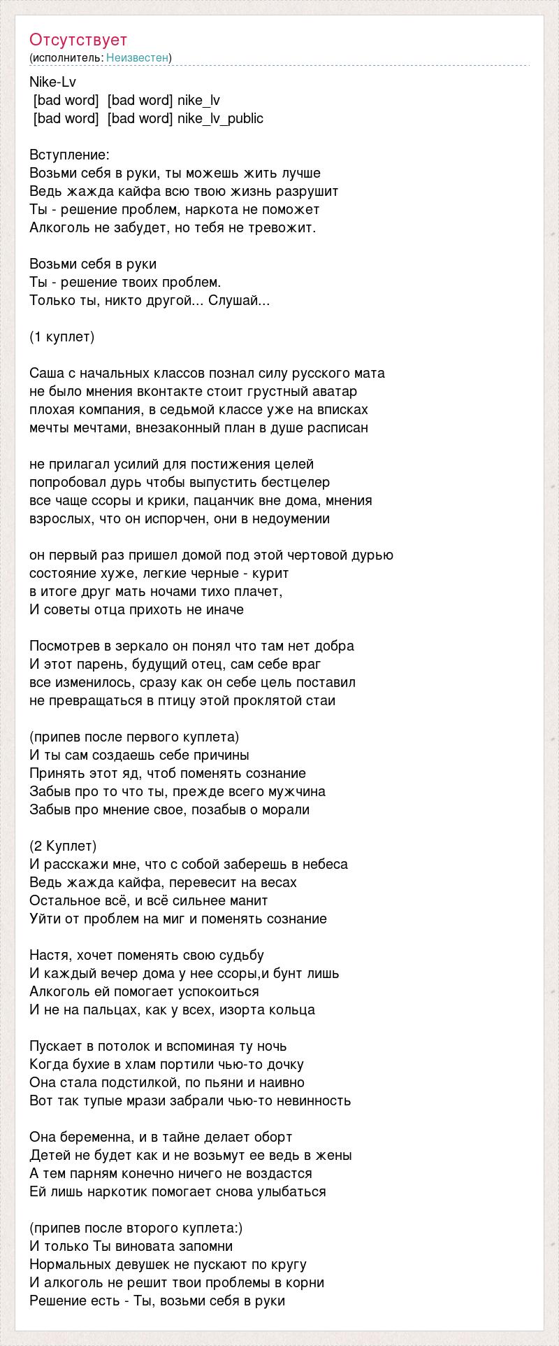 Nike-Lv [bad word] [bad word] nike_lv [bad word] [bad word] nike_lv_public Вступление: Возьми себя в руки, ты можешь жить лучше Ведь жажда кайфа всю твою жизнь разрушит Ты - решение проблем, наркота не поможет Алкоголь не забудет, но тебя не тревожит. Возьми себя в руки Ты - решение твоих проблем. Только ты, никто другой... Слушай... (1 куплет) Саша с начальных классов познал силу русского мата не было мнения вконтакте стоит грустный аватар плохая компания, в седьмой классе уже на вписках мечты мечтами, внезаконный план в душе расписан не прилагал усилий для постижения целей попробовал дурь чтобы выпустить бестцелер все чаще ссоры и крики, пацанчик вне дома, мнения взрослых, что он испорчен, они в недоумении он первый раз пришел домой под этой чертовой дурью состояние хуже, легкие черные - курит в итоге друг мать ночами тихо плачет, И советы отца прихоть не иначе Посмотрев в зеркало он понял что там нет добра И этот парень, будущий отец, сам себе враг все изменилось, сразу как он себе цель поставил не превращаться в птицу этой проклятой стаи (припев после первого куплета) И ты сам создаешь себе причины Принять этот яд, чтоб поменять сознание Забыв про то что ты, прежде всего мужчина Забыв про мнение свое, позабыв о морали (2 Куплет) И расскажи мне, что с собой заберешь в небеса Ведь жажда кайфа, перевесит на весах Остальное всё, и всё сильнее манит Уйти от проблем на миг и поменять сознание Настя, хочет поменять свою судьбу И каждый вечер дома у нее ссоры,и бунт лишь Алкоголь ей помогает успокоиться И не на пальцах, как у всех, изорта кольца Пускает в потолок и вспоминая ту ночь Когда бухие в хлам портили чью-то дочку Она стала подстилкой, по пьяни и наивно Вот так тупые мрази забрали чью-то невинность Она беременна, и в тайне делает оборт Детей не будет как и не возьмут ее ведь в жены А тем парням конечно ничего не воздастся Ей лишь наркотик помогает снова улыбаться (припев после второго куплета:) И только Ты виновата запомни Нормальных девушек не пускают по кругу И алкоголь не решит твои проблемы в корни Решение есть - Ты, возьми себя в руки