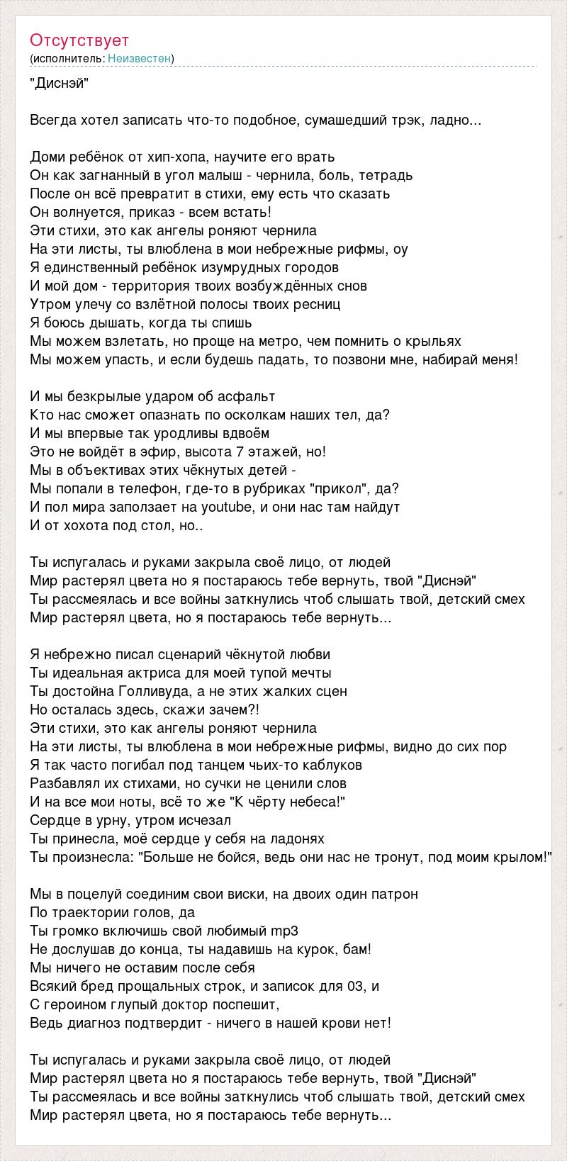 "Диснэй" Всегда хотел записать что-то подобное, сумашедший трэк, ладно... Доми ребёнок от хип-хопа, научите его врать Он как загнанный в угол малыш - чернила, боль, тетрадь После он всё превратит в стихи, ему есть что сказать Он волнуется, приказ - всем встать! Эти стихи, это как ангелы роняют чернила На эти листы, ты влюблена в мои небрежные рифмы, оу Я единственный ребёнок изумрудных городов И мой дом - территория твоих возбуждённых снов Утром улечу со взлётной полосы твоих ресниц Я боюсь дышать, когда ты спишь Мы можем взлетать, но проще на метро, чем помнить о крыльях Мы можем упасть, и если будешь падать, то позвони мне, набирай меня! И мы безкрылые ударом об асфальт Кто нас сможет опазнать по осколкам наших тел, да? И мы впервые так уродливы вдвоём Это не войдёт в эфир, высота 7 этажей, но! Мы в объективах этих чёкнутых детей - Мы попали в телефон, где-то в рубриках "прикол", да? И пол мира заползает на youtube, и они нас там найдут И от хохота под стол, но.. Ты испугалась и руками закрыла своё лицо, от людей Мир растерял цвета но я постараюсь тебе вернуть, твой "Диснэй" Ты рассмеялась и все войны заткнулись чтоб слышать твой, детский смех Мир растерял цвета, но я постараюсь тебе вернуть... Я небрежно писал сценарий чёкнутой любви Ты идеальная актриса для моей тупой мечты Ты достойна Голливуда, а не этих жалких сцен Но осталась здесь, скажи зачем?! Эти стихи, это как ангелы роняют чернила На эти листы, ты влюблена в мои небрежные рифмы, видно до сих пор Я так часто погибал под танцем чьих-то каблуков Разбавлял их стихами, но сучки не ценили слов И на все мои ноты, всё то же "К чёрту небеса!" Сердце в урну, утром исчезал Ты принесла, моё сердце у себя на ладонях Ты произнесла: "Больше не бойся, ведь они нас не тронут, под моим крылом!" Мы в поцелуй соединим свои виски, на двоих один патрон По траектории голов, да Ты громко включишь свой любимый mp3 Не дослушав до конца, ты надавишь на курок, бам! Мы ничего не оставим после себя Всякий бред прощальных строк, и записок для 03, и С героином глупый доктор поспешит, Ведь диагноз подтвердит - ничего в нашей крови нет! Ты испугалась и руками закрыла своё лицо, от людей Мир растерял цвета но я постараюсь тебе вернуть, твой "Диснэй" Ты рассмеялась и все войны заткнулись чтоб слышать твой, детский смех Мир растерял цвета, но я постараюсь тебе вернуть...
