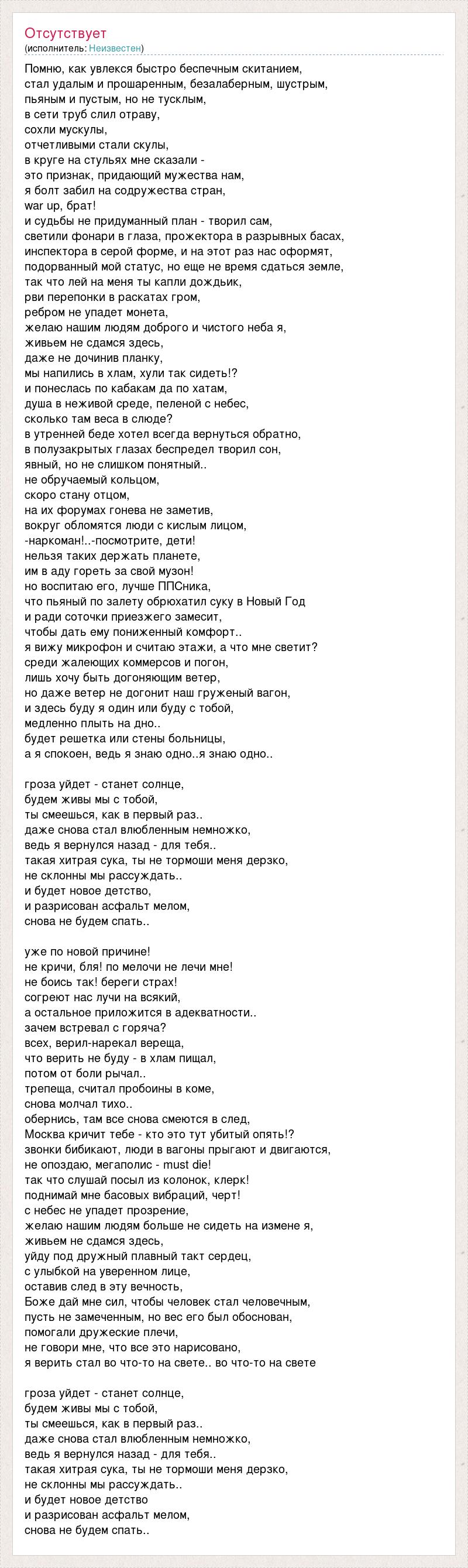 Помню, как увлекся быстро беспечным скитанием, стал удалым и прошаренным, безалаберным, шустрым, пьяным и пустым, но не тусклым, в сети труб слил отраву, сохли мускулы, отчетливыми стали скулы, в круге на стульях мне сказали - это признак, придающий мужества нам, я болт забил на содружества стран, war up, брат! и судьбы не придуманный план - творил сам, светили фонари в глаза, прожектора в разрывных басах, инспектора в серой форме, и на этот раз нас оформят, подорванный мой статус, но еще не время сдаться земле, так что лей на меня ты капли дождьик, рви перепонки в раскатах гром, ребром не упадет монета, желаю нашим людям доброго и чистого неба я, живьем не сдамся здесь, даже не дочинив планку, мы напились в хлам, хули так сидеть!? и понеслась по кабакам да по хатам, душа в неживой среде, пеленой с небес, сколько там веса в слюде? в утренней беде хотел всегда вернуться обратно, в полузакрытых глазах беспредел творил сон, явный, но не слишком понятный.. не обручаемый кольцом, скоро стану отцом, на их форумах гонева не заметив, вокруг обломятся люди с кислым лицом, -наркоман!..-посмотрите, дети! нельзя таких держать планете, им в аду гореть за свой музон! но воспитаю его, лучше ППСника, что пьяный по залету обрюхатил суку в Новый Год и ради соточки приезжего замесит, чтобы дать ему пониженный комфорт.. я вижу микрофон и считаю этажи, а что мне светит? среди жалеющих коммерсов и погон, лишь хочу быть догоняющим ветер, но даже ветер не догонит наш груженый вагон, и здесь буду я один или буду с тобой, медленно плыть на дно.. будет решетка или стены больницы, а я спокоен, ведь я знаю одно..я знаю одно.. гроза уйдет - станет солнце, будем живы мы с тобой, ты смеешься, как в первый раз.. даже снова стал влюбленным немножко, ведь я вернулся назад - для тебя.. такая хитрая сука, ты не тормоши меня дерзко, не склонны мы рассуждать.. и будет новое детство, и разрисован асфальт мелом, снова не будем спать.. уже по новой причине! не кричи, бля! по мелочи не лечи мне! не боись так! береги страх! согреют нас лучи на всякий, а остальное приложится в адекватности.. зачем встревал с горяча? всех, верил-нарекал вереща, что верить не буду - в хлам пищал, потом от боли рычал.. трепеща, считал пробоины в коме, снова молчал тихо.. обернись, там все снова смеются в след, Москва кричит тебе - кто это тут убитый опять!? звонки бибикают, люди в вагоны прыгают и двигаются, не опоздаю, мегаполис - must die! так что слушай посыл из колонок, клерк! поднимай мне басовых вибраций, черт! с небес не упадет прозрение, желаю нашим людям больше не сидеть на измене я, живьем не сдамся здесь, уйду под дружный плавный такт сердец, с улыбкой на уверенном лице, оставив след в эту вечность, Боже дай мне сил, чтобы человек стал человечным, пусть не замеченным, но вес его был обоснован, помогали дружеские плечи, не говори мне, что все это нарисовано, я верить стал во что-то на свете.. во что-то на свете гроза уйдет - станет солнце, будем живы мы с тобой, ты смеешься, как в первый раз.. даже снова стал влюбленным немножко, ведь я вернулся назад - для тебя.. такая хитрая сука, ты не тормоши меня дерзко, не склонны мы рассуждать.. и будет новое детство и разрисован асфальт мелом, снова не будем спать..