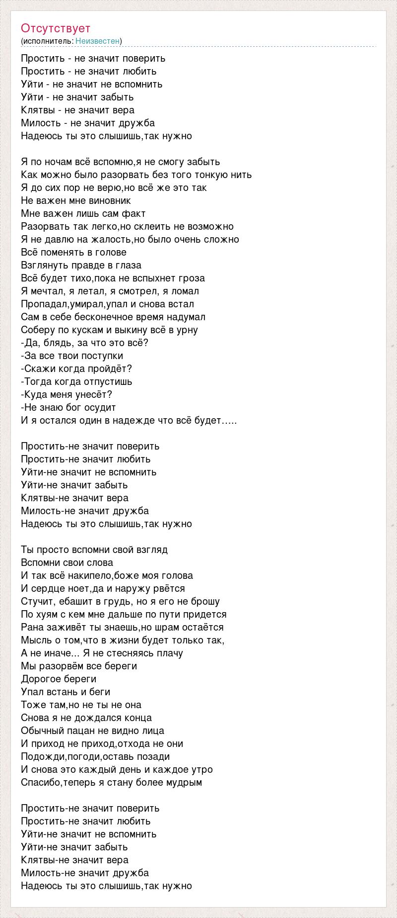 Простить - не значит поверить Простить - не значит любить Уйти - не значит не вспомнить Уйти - не значит забыть Клятвы - не значит вера Милость - не значит дружба Надеюсь ты это слышишь,так нужно Я по ночам всё вспомню,я не смогу забыть Как можно было разорвать без того тонкую нить Я до сих пор не верю,но всё же это так Не важен мне виновник Мне важен лишь сам факт Разорвать так легко,но склеить не возможно Я не давлю на жалость,но было очень сложно Всё поменять в голове Взглянуть правде в глаза Всё будет тихо,пока не вспыхнет гроза Я мечтал, я летал, я смотрел, я ломал Пропадал,умирал,упал и снова встал Сам в себе бесконечное время надумал Соберу по кускам и выкину всё в урну -Да, блядь, за что это всё? -За все твои поступки -Скажи когда пройдёт? -Тогда когда отпустишь -Куда меня унесёт? -Не знаю бог осудит И я остался один в надежде что всё будет….. Простить-не значит поверить Простить-не значит любить Уйти-не значит не вспомнить Уйти-не значит забыть Клятвы-не значит вера Милость-не значит дружба Надеюсь ты это слышишь,так нужно Ты просто вспомни свой взгляд Вспомни свои слова И так всё накипело,боже моя голова И сердце ноет,да и наружу рвётся Стучит, ебашит в грудь, но я его не брошу По хуям с кем мне дальше по пути придется Рана заживёт ты знаешь,но шрам остаётся Мысль о том,что в жизни будет только так, А не иначе... Я не стесняясь плачу Мы разорвём все береги Дорогое береги Упал встань и беги Тоже там,но не ты не она Снова я не дождался конца Обычный пацан не видно лица И приход не приход,отхода не они Подожди,погоди,оставь позади И снова это каждый день и каждое утро Спасибо,теперь я стану более мудрым Простить-не значит поверить Простить-не значит любить Уйти-не значит не вспомнить Уйти-не значит забыть Клятвы-не значит вера Милость-не значит дружба Надеюсь ты это слышишь,так нужно