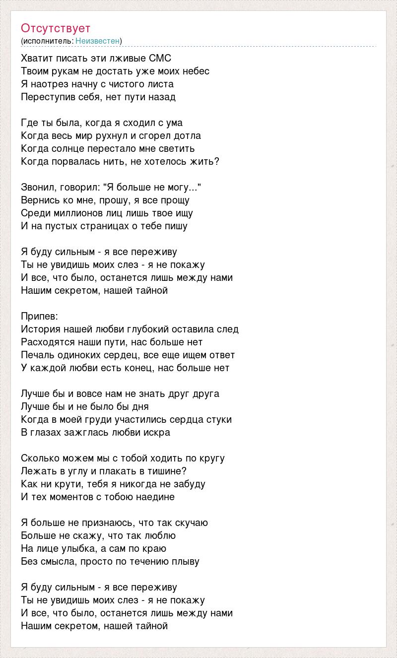 Хватит писать эти лживые СМС Твоим рукам не достать уже моих небес Я наотрез начну с чистого листа Переступив себя, нет пути назад Где ты была, когда я сходил с ума Когда весь мир рухнул и сгорел дотла Когда солнце перестало мне светить Когда порвалась нить, не хотелось жить? Звонил, говорил: "Я больше не могу..." Вернись ко мне, прошу, я все прощу Среди миллионов лиц лишь твое ищу И на пустых страницах о тебе пишу Я буду сильным - я все переживу Ты не увидишь моих слез - я не покажу И все, что было, останется лишь между нами Нашим секретом, нашей тайной Припев: История нашей любви глубокий оставила след Расходятся наши пути, нас больше нет Печаль одиноких сердец, все еще ищем ответ У каждой любви есть конец, нас больше нет Лучше бы и вовсе нам не знать друг друга Лучше бы и не было бы дня Когда в моей груди участились сердца стуки В глазах зажглась любви искра Сколько можем мы с тобой ходить по кругу Лежать в углу и плакать в тишине? Как ни крути, тебя я никогда не забуду И тех моментов с тобою наедине Я больше не признаюсь, что так скучаю Больше не скажу, что так люблю На лице улыбка, а сам по краю Без смысла, просто по течению плыву Я буду сильным - я все переживу Ты не увидишь моих слез - я не покажу И все, что было, останется лишь между нами Нашим секретом, нашей тайной