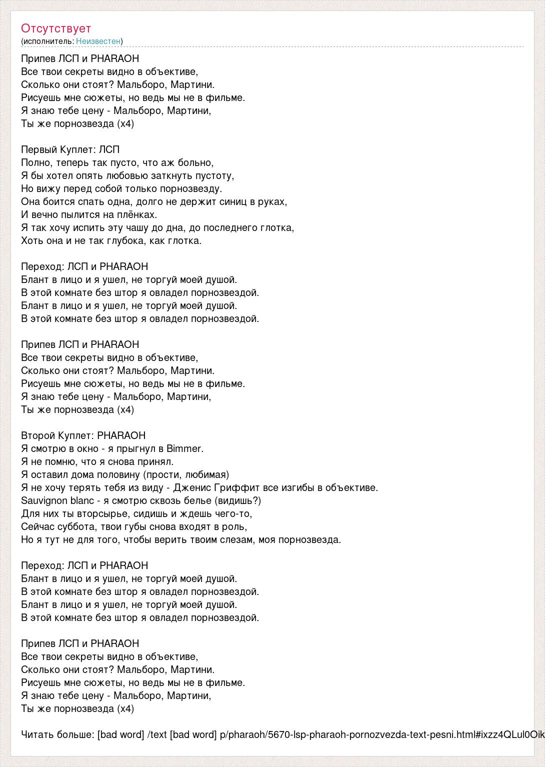 Припев ЛСП и PHARAOH Все твои секреты видно в объективе, Сколько они стоят? Мальборо, Мартини. Рисуешь мне сюжеты, но ведь мы не в фильме. Я знаю тебе цену - Мальборо, Мартини, Ты же порнозвезда (х4) Первый Куплет: ЛСП Полно, теперь так пусто, что аж больно, Я бы хотел опять любовью заткнуть пустоту, Но вижу перед собой только порнозвезду. Она боится спать одна, долго не держит синиц в руках, И вечно пылится на плёнках. Я так хочу испить эту чашу до дна, до последнего глотка, Хоть она и не так глубока, как глотка. Переход: ЛСП и PHARAOH Блант в лицо и я ушел, не торгуй моей душой. В этой комнате без штор я овладел порнозвездой. Блант в лицо и я ушел, не торгуй моей душой. В этой комнате без штор я овладел порнозвездой. Припев ЛСП и PHARAOH Все твои секреты видно в объективе, Сколько они стоят? Мальборо, Мартини. Рисуешь мне сюжеты, но ведь мы не в фильме. Я знаю тебе цену - Мальборо, Мартини, Ты же порнозвезда (х4) Второй Куплет: PHARAOH Я смотрю в окно - я прыгнул в Bimmer. Я не помню, что я снова принял. Я оставил дома половину (прости, любимая) Я не хочу терять тебя из виду - Дженис Гриффит все изгибы в объективе. Sauvignon blanc - я смотрю сквозь белье (видишь?) Для них ты вторсырье, сидишь и ждешь чего-то, Сейчас суббота, твои губы снова входят в роль, Но я тут не для того, чтобы верить твоим слезам, моя порнозвезда. Переход: ЛСП и PHARAOH Блант в лицо и я ушел, не торгуй моей душой. В этой комнате без штор я овладел порнозвездой. Блант в лицо и я ушел, не торгуй моей душой. В этой комнате без штор я овладел порнозвездой. Припев ЛСП и PHARAOH Все твои секреты видно в объективе, Сколько они стоят? Мальборо, Мартини. Рисуешь мне сюжеты, но ведь мы не в фильме. Я знаю тебе цену - Мальборо, Мартини, Ты же порнозвезда (х4) Читать больше: [bad word] /text [bad word] p/pharaoh/5670-lsp-pharaoh-pornozvezda-text-pesni.html#ixzz4QLul0Oik