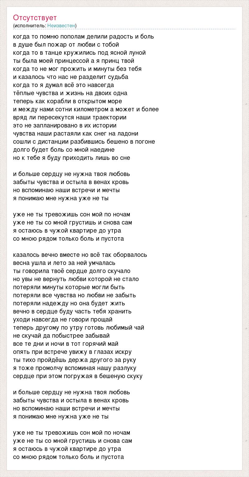 когда то помню пополам делили радость и боль в душе был пожар от любви с тобой когда то в танце кружились под ясной луной ты была моей принцессой а я принц твой когда то не мог прожить и минуты без тебя и казалось что нас не разделит судьба когда то я думал всё это навсегда тёплые чувства и жизнь на двоих одна теперь как корабли в открытом море и между нами сотни километром а может и более вряд ли пересекутся наши траектории это не запланировано в их истории чувства наши растаяли как снег на ладони сошли с дистанции разбившись бешено в погоне долго будет боль со мной наедине но к тебе я буду приходить лишь во сне и больше сердцу не нужна твоя любовь забыты чувства и остыла в венах кровь но вспоминаю наши встречи и мечты я понимаю мне нужна уже не ты уже не ты тревожишь сон мой по ночам уже не ты со мной грустишь и снова сам я остаюсь в чужой квартире до утра со мною рядом только боль и пустота казалось вечно вместе но всё так оборвалось весна ушла и лето за ней умчалась ты говорила твоё сердце долго скучало но увы не вернуть любви которой не стало потеряли минуты которые могли быть потеряли все чувства но любви не забыть потеряли надежду но она будет жить вечно в сердце буду часть тебя хранить уходи навсегда не говори прощай теперь другому по утру готовь любимый чай не скучай да побыстрее забывай все те дни и ночи в тот горячий май опять при встрече увижу в глазах искру ты тихо пройдёшь держа другого за руку я тоже промолчу вспоминая нашу разлуку сердце при этом погружая в бешеную скуку и больше сердцу не нужна твоя любовь забыты чувства и остыла в венах кровь но вспоминаю наши встречи и мечты я понимаю мне нужна уже не ты уже не ты тревожишь сон мой по ночам уже не ты со мной грустишь и снова сам я остаюсь в чужой квартире до утра со мною рядом только боль и пустота