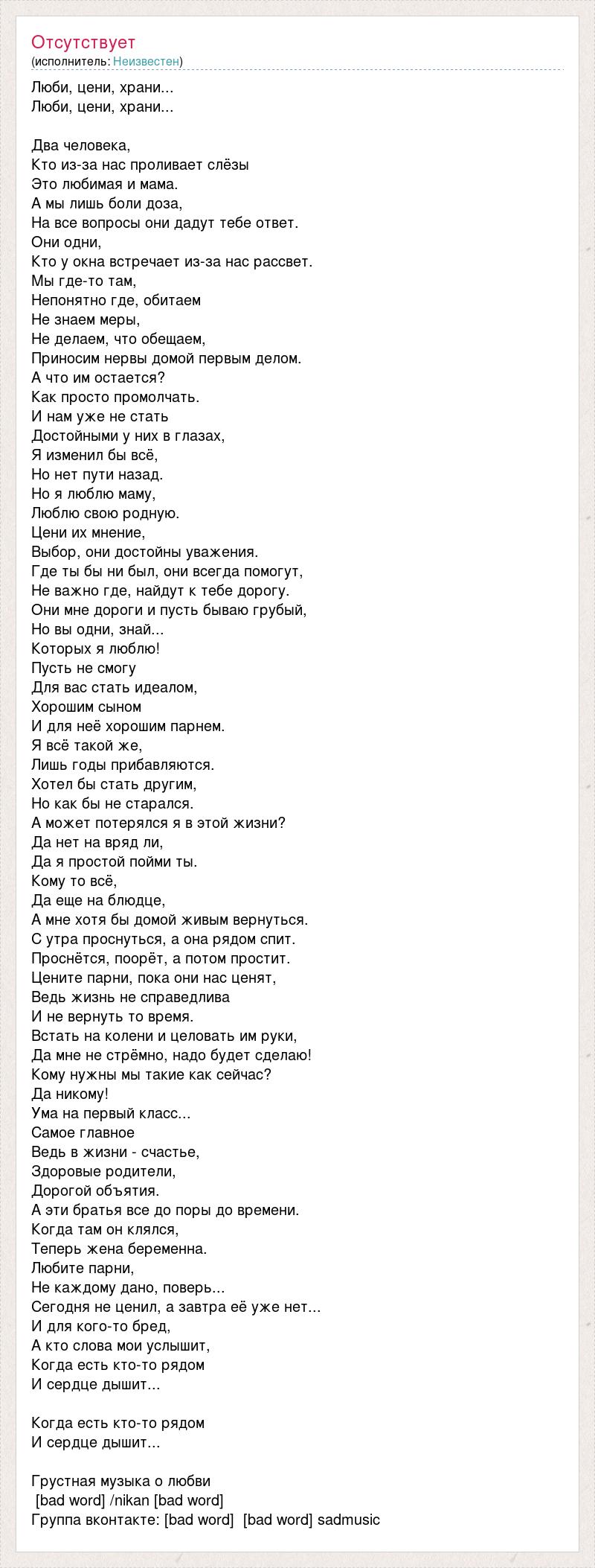 Люби, цени, храни... Люби, цени, храни... Два человека, Кто из-за нас проливает слёзы Это любимая и мама. А мы лишь боли доза, На все вопросы они дадут тебе ответ. Они одни, Кто у окна встречает из-за нас рассвет. Мы где-то там, Непонятно где, обитаем Не знаем меры, Не делаем, что обещаем, Приносим нервы домой первым делом. А что им остается? Как просто промолчать. И нам уже не стать Достойными у них в глазах, Я изменил бы всё, Но нет пути назад. Но я люблю маму, Люблю свою родную. Цени их мнение, Выбор, они достойны уважения. Где ты бы ни был, они всегда помогут, Не важно где, найдут к тебе дорогу. Они мне дороги и пусть бываю грубый, Но вы одни, знай... Которых я люблю! Пусть не смогу Для вас стать идеалом, Хорошим сыном И для неё хорошим парнем. Я всё такой же, Лишь годы прибавляются. Хотел бы стать другим, Но как бы не старался. А может потерялся я в этой жизни? Да нет на вряд ли, Да я простой пойми ты. Кому то всё, Да еще на блюдце, А мне хотя бы домой живым вернуться. С утра проснуться, а она рядом спит. Проснётся, поорёт, а потом простит. Цените парни, пока они нас ценят, Ведь жизнь не справедлива И не вернуть то время. Встать на колени и целовать им руки, Да мне не стрёмно, надо будет сделаю! Кому нужны мы такие как сейчас? Да никому! Ума на первый класс... Самое главное Ведь в жизни - счастье, Здоровые родители, Дорогой объятия. А эти братья все до поры до времени. Когда там он клялся, Теперь жена беременна. Любите парни, Не каждому дано, поверь... Сегодня не ценил, а завтра её уже нет... И для кого-то бред, А кто слова мои услышит, Когда есть кто-то рядом И сердце дышит... Когда есть кто-то рядом И сердце дышит... Грустная музыка о любви [bad word] /nikan [bad word] Группа вконтакте: [bad word] [bad word] sadmusic