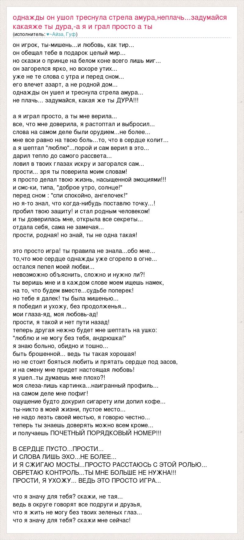 он игрок, ты-мишень...и любовь, как тир... он обещал тебе в подарок целый мир... но сказки о принце на белом коне всего лишь миг... он загорелся ярко, но вскоре утих... уже не те слова с утра и перед сном... его влечет азарт, а не родной дом... однажды он ушел и треснула стрела амура... не плачь... задумайся, какая же ты ДУРА!!! а я играл просто, а ты мне верила... все, что мне доверила, я растоптал и выбросил... слова на самом деле были орудием...не более... мне все равно на твою боль...то, что в сердце колит... а я шептал "люблю"...порой и сам верил в это... дарил тепло до самого рассвета... ловил в твоих глазах искру и загорался сам... прости... зря ты поверила моим словам! я просто делал твою жизнь, насыщенной эмоциями!!! и смс-ки, типа, "доброе утро, солнце!" перед сном : "спи спокойно, ангелочек!" но я-то знал, что когда-нибудь поставлю точку...! пробил твою защиту! и стал родным человеком! и ты доверилась мне, открыла все секреты... отдала себя, сама не замечая... прости, родная! но знай, ты не одна такая! это просто игра! ты правила не знала...обо мне... то,что мое сердце однажды уже сгорело в огне... остался пепел моей любви... невозможно объяснить, сложно и нужно ли?! ты веришь мне и в каждом слове моем ищешь намек, на то, что будем вместе...судьбе поперек! но тебе я далек! ты была мишенью... я победил и ухожу, без продолженья... мои глаза-яд, моя любовь-ад! прости, я такой и нет пути назад! теперь другая нежно будет мне шептать на ушко: "люблю и не могу без тебя, андрюшка!" я знаю больно, обидно и тошно... быть брошенной... ведь ты такая хорошая! но не стоит бояться любить и прятать сердце под засов, и на смену мне придет настоящая любовь! я ушел..ты думаешь мне плохо?! моя слеза-лишь картинка...наигранный профиль... на самом деле мне пофиг! ощущение будто докурил сигарету или допил кофе... ты-никто в моей жизни, пустое место... не надо лезть своей местью, я говорю честно... теперь ты знаешь доверять можно всем кроме... и получаешь ПОЧЕТНЫЙ ПОРЯДКОВЫЙ НОМЕР!!! В СЕРДЦЕ ПУСТО...ПРОСТИ... И СЛОВА ЛИШЬ ЭХО...НЕ БОЛЕЕ... И Я СЖИГАЮ МОСТЫ...ПРОСТО РАССТАЮСЬ С ЭТОЙ РОЛЬЮ... ОБРЕТАЮ КОНТРОЛЬ...ТЫ МНЕ БОЛЬШЕ НЕ НУЖНА!!! ПРОСТИ, Я УХОЖУ... ВЕДЬ ЭТО ПРОСТО ИГРА... что я значу для тебя? скажи, не тая... ведь в округе говорят все подруги и друзья, что я жить не могу без твоих зеленых глаз... что я значу для тебя? скажи мне сейчас!
