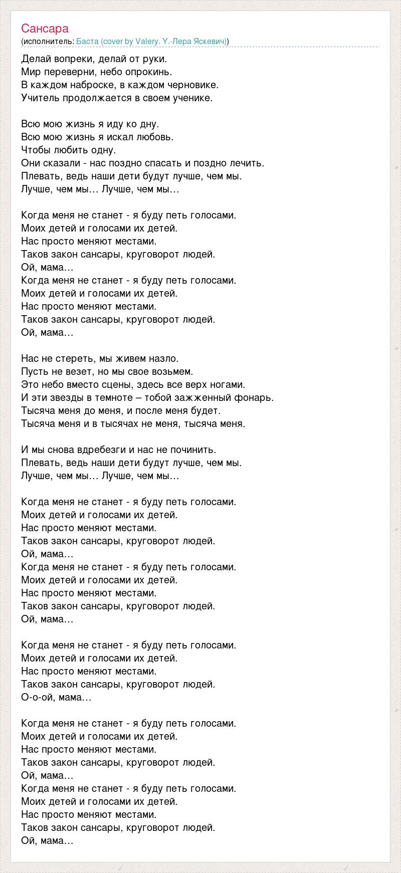 Делай вопреки, делай от руки. Мир переверни, небо опрокинь. В каждом наброске, в каждом черновике. Учитель продолжается в своем ученике. Всю мою жизнь я иду ко дну. Всю мою жизнь я искал любовь. Чтобы любить одну. Они сказали - нас поздно спасать и поздно лечить. Плевать, ведь наши дети будут лучше, чем мы. Лучше, чем мы… Лучше, чем мы… Когда меня не станет - я буду петь голосами. Моих детей и голосами их детей. Нас просто меняют местами. Таков закон сансары, круговорот людей. Ой, мама… Когда меня не станет - я буду петь голосами. Моих детей и голосами их детей. Нас просто меняют местами. Таков закон сансары, круговорот людей. Ой, мама… Нас не стереть, мы живем назло. Пусть не везет, но мы свое возьмем. Это небо вместо сцены, здесь все верх ногами. И эти звезды в темноте – тобой зажженный фонарь. Тысяча меня до меня, и после меня будет. Тысяча меня и в тысячах не меня, тысяча меня. И мы снова вдребезги и нас не починить. Плевать, ведь наши дети будут лучше, чем мы. Лучше, чем мы… Лучше, чем мы… Когда меня не станет - я буду петь голосами. Моих детей и голосами их детей. Нас просто меняют местами. Таков закон сансары, круговорот людей. Ой, мама… Когда меня не станет - я буду петь голосами. Моих детей и голосами их детей. Нас просто меняют местами. Таков закон сансары, круговорот людей. Ой, мама… Когда меня не станет - я буду петь голосами. Моих детей и голосами их детей. Нас просто меняют местами. Таков закон сансары, круговорот людей. О-о-ой, мама… Когда меня не станет - я буду петь голосами. Моих детей и голосами их детей. Нас просто меняют местами. Таков закон сансары, круговорот людей. Ой, мама… Когда меня не станет - я буду петь голосами. Моих детей и голосами их детей. Нас просто меняют местами. Таков закон сансары, круговорот людей. Ой, мама…