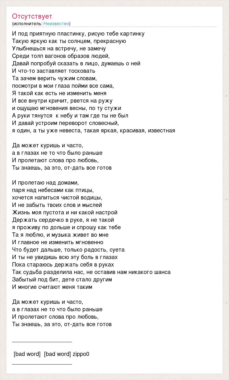 И под приятную пластинку, рисую тебе картинку Такую яркую как ты солнцем, прекрасную Улыбнешься на встречу, не замечу Среди толп вагонов образов людей, Давай попробуй сказать в лицо, думаешь о ней И что-то заставляет тосковать Та зачем верить чужим словам, посмотри в мои глаза пойми все сама, Я такой как есть не изменить меня И все внутри кричит, рвется на ружу и ощущаю мгновения весны, по ту стужи А руки тянутся к небу и там где ты не был И давай устроим переворот словесный, я один, а ты уже невеста, такая яркая, красивая, известная Да может куришь и часто, а в глазах не то что было раньше И пролетают слова про любовь, Ты знаешь, за это, от-дать все готов И пролетаю над домами, паря над небесами как птицы, хочется напиться чистой водицы, И не забыть твоих слов и мыслей Жизнь моя пустота и ни какой настрой Держать сердечко в руке, я не такой я проживу по дольше и спрошу как тебе Та я люблю, и музыка живет во мне И главное не изменить мгновенно Что будет дальше, только радость, суета И ты не увидишь всю эту боль в глазах Пока стараюсь держать себя в руках Так судьба разделила нас, не оставив нам никакого шанса Забытый под бит, дете стало другим И многие считают меня таким Да может куришь и часто, а в глазах не то что было раньше И пролетают слова про любовь, Ты знаешь, за это, от-дать все готов ___________________ [bad word] [bad word] zippo0 ___________________