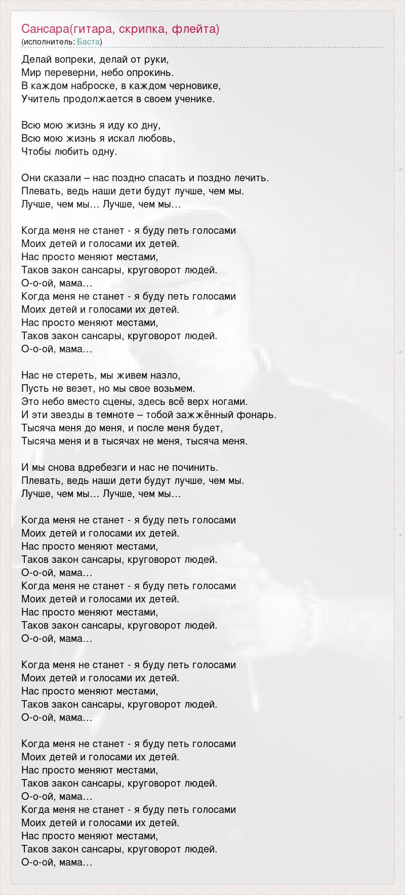 Делай вопреки, делай от руки, Мир переверни, небо опрокинь. В каждом наброске, в каждом черновике, Учитель продолжается в своем ученике. Всю мою жизнь я иду ко дну, Всю мою жизнь я искал любовь, Чтобы любить одну. Они сказали – нас поздно спасать и поздно лечить. Плевать, ведь наши дети будут лучше, чем мы. Лучше, чем мы… Лучше, чем мы… Когда меня не станет - я буду петь голосами Моих детей и голосами их детей. Нас просто меняют местами, Таков закон сансары, круговорот людей. О-о-ой, мама… Когда меня не станет - я буду петь голосами Моих детей и голосами их детей. Нас просто меняют местами, Таков закон сансары, круговорот людей. О-о-ой, мама… Нас не стереть, мы живем назло, Пусть не везет, но мы свое возьмем. Это небо вместо сцены, здесь всё верх ногами. И эти звезды в темноте – тобой зажжённый фонарь. Тысяча меня до меня, и после меня будет, Тысяча меня и в тысячах не меня, тысяча меня. И мы снова вдребезги и нас не починить. Плевать, ведь наши дети будут лучше, чем мы. Лучше, чем мы… Лучше, чем мы… Когда меня не станет - я буду петь голосами Моих детей и голосами их детей. Нас просто меняют местами, Таков закон сансары, круговорот людей. О-о-ой, мама… Когда меня не станет - я буду петь голосами Моих детей и голосами их детей. Нас просто меняют местами, Таков закон сансары, круговорот людей. О-о-ой, мама… Когда меня не станет - я буду петь голосами Моих детей и голосами их детей. Нас просто меняют местами, Таков закон сансары, круговорот людей. О-о-ой, мама… Когда меня не станет - я буду петь голосами Моих детей и голосами их детей. Нас просто меняют местами, Таков закон сансары, круговорот людей. О-о-ой, мама… Когда меня не станет - я буду петь голосами Моих детей и голосами их детей. Нас просто меняют местами, Таков закон сансары, круговорот людей. О-о-ой, мама…