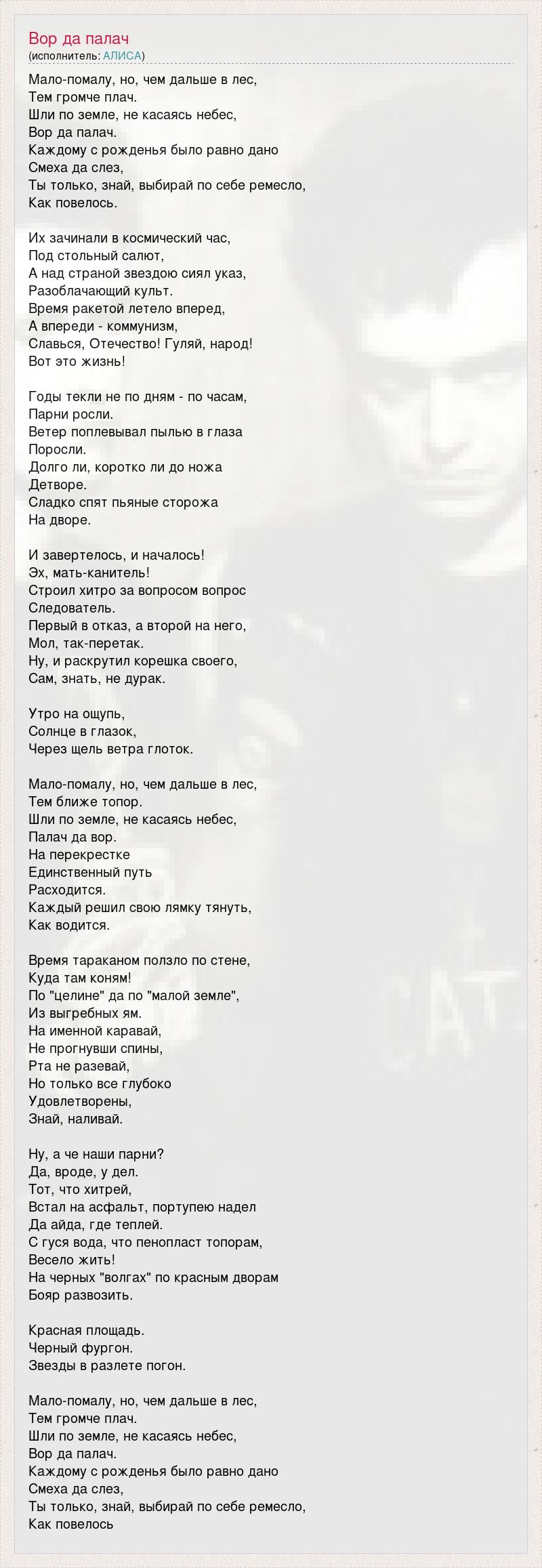 Мало-помалу, но, чем дальше в лес, Тем громче плач. Шли по земле, не касаясь небес, Вор да палач. Каждому с рожденья было равно дано Смеха да слез, Ты только, знай, выбирай по себе ремесло, Как повелось. Их зачинали в космический час, Под стольный салют, А над страной звездою сиял указ, Разоблачающий культ. Время ракетой летело вперед, А впереди - коммунизм, Славься, Отечество! Гуляй, народ! Вот это жизнь! Годы текли не по дням - по часам, Парни росли. Ветер поплевывал пылью в глаза Поросли. Долго ли, коротко ли до ножа Детворе. Сладко спят пьяные сторожа На дворе. И завертелось, и началось! Эх, мать-канитель! Строил хитро за вопросом вопрос Следователь. Первый в отказ, а второй на него, Мол, так-перетак. Ну, и раскрутил корешка своего, Сам, знать, не дурак. Утро на ощупь, Солнце в глазок, Через щель ветра глоток. Мало-помалу, но, чем дальше в лес, Тем ближе топор. Шли по земле, не касаясь небес, Палач да вор. На перекрестке Единственный путь Расходится. Каждый решил свою лямку тянуть, Как водится. Время тараканом ползло по стене, Куда там коням! По "целине" да по "малой земле", Из выгребных ям. На именной каравай, Не прогнувши спины, Рта не разевай, Но только все глубоко Удовлетворены, Знай, наливай. Ну, а че наши парни? Да, вроде, у дел. Тот, что хитрей, Встал на асфальт, портупею надел Да айда, где теплей. С гуся вода, что пенопласт топорам, Весело жить! На черных "волгах" по красным дворам Бояр развозить. Красная площадь. Черный фургон. Звезды в разлете погон. Мало-помалу, но, чем дальше в лес, Тем громче плач. Шли по земле, не касаясь небес, Вор да палач. Каждому с рожденья было равно дано Смеха да слез, Ты только, знай, выбирай по себе ремесло, Как повелось