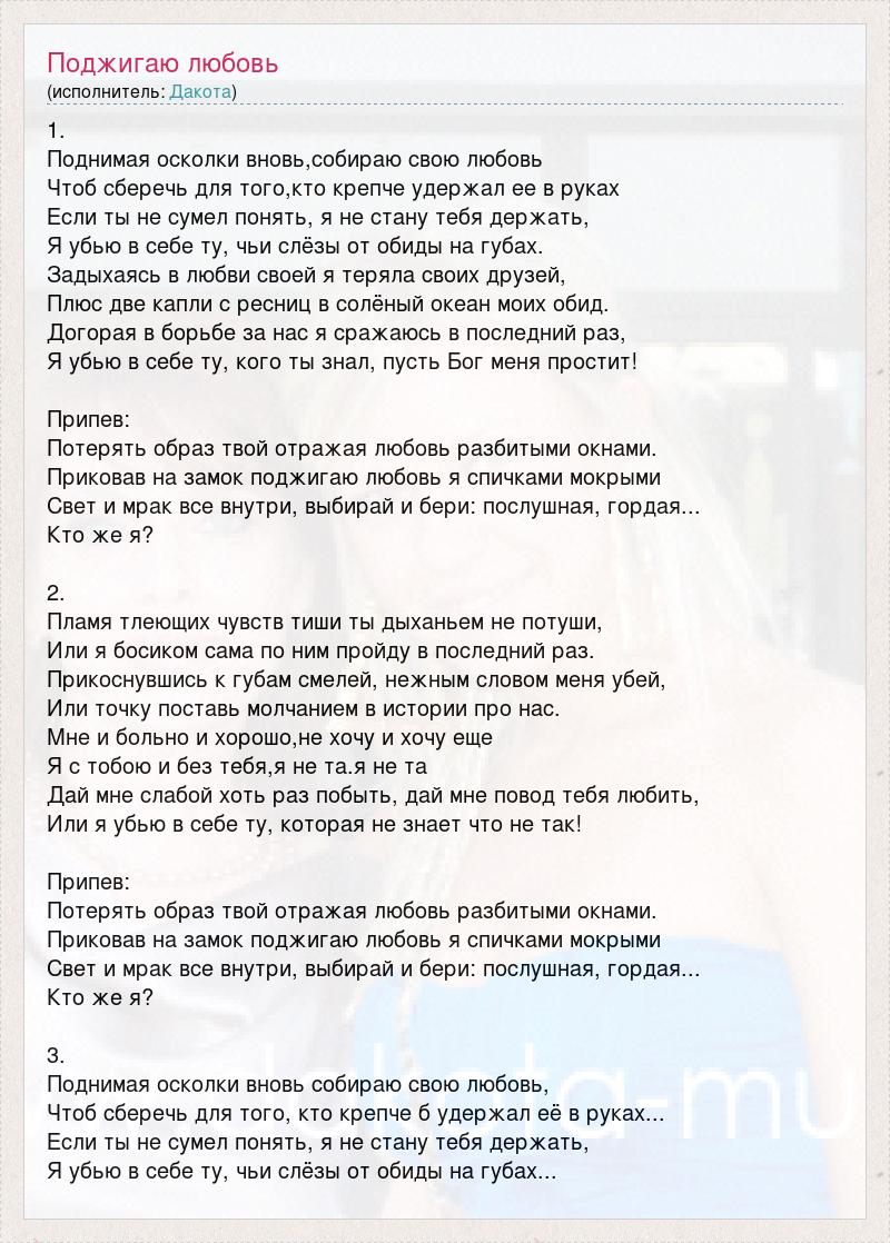 1. Поднимая осколки вновь,собираю свою любовь Чтоб сберечь для того,кто крепче удержал ее в руках Если ты не сумел понять, я не стану тебя держать, Я убью в себе ту, чьи слёзы от обиды на губах. Задыхаясь в любви своей я теряла своих друзей, Плюс две капли с ресниц в солёный океан моих обид. Догорая в борьбе за нас я сражаюсь в последний раз, Я убью в себе ту, кого ты знал, пусть Бог меня простит! Припев: Потерять образ твой отражая любовь разбитыми окнами. Приковав на замок поджигаю любовь я спичками мокрыми Свет и мрак все внутри, выбирай и бери: послушная, гордая... Кто же я? 2. Пламя тлеющих чувств тиши ты дыханьем не потуши, Или я босиком сама по ним пройду в последний раз. Прикоснувшись к губам смелей, нежным словом меня убей, Или точку поставь молчанием в истории про нас. Мне и больно и хорошо,не хочу и хочу еще Я с тобою и без тебя,я не та.я не та Дай мне слабой хоть раз побыть, дай мне повод тебя любить, Или я убью в себе ту, которая не знает что не так! Припев: Потерять образ твой отражая любовь разбитыми окнами. Приковав на замок поджигаю любовь я спичками мокрыми Свет и мрак все внутри, выбирай и бери: послушная, гордая... Кто же я? 3. Поднимая осколки вновь собираю свою любовь, Чтоб сберечь для того, кто крепче б удержал её в руках... Если ты не сумел понять, я не стану тебя держать, Я убью в себе ту, чьи слёзы от обиды на губах...