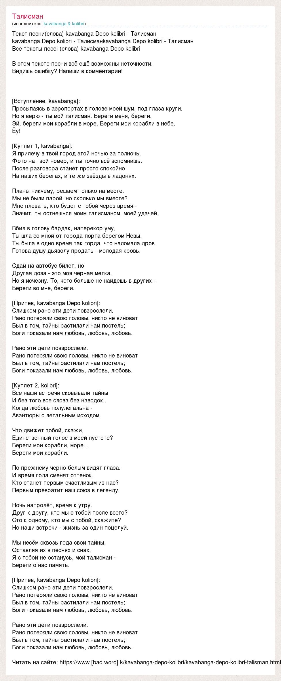 Текст песни(слова) kavabanga Depo kolibri - Талисман kavabanga Depo kolibri - Талисманkavabanga Depo kolibri - Талисман Все тексты песен(слова) kavabanga Depo kolibri В этом тексте песни всё ещё возможны неточности. Видишь ошибку? Напиши в комментарии! [Вступление, kavabanga]: Просыпаясь в аэропортах в голове моей шум, под глаза круги. Но я верю - ты мой талисман. Береги меня, береги. Эй, береги мои корабли в море. Береги мои корабли в небе. Ёу! [Куплет 1, kavabanga]: Я прилечу в твой город этой ночью за полночь. Фото на твой номер, и ты точно всё вспомнишь. После разговора станет просто спокойно На наших берегах, и те же звёзды в ладонях. Планы никчему, решаем только на месте. Мы не были парой, но сколько мы вместе? Мне плевать, кто будет с тобой через время - Значит, ты остнешься моим талисманом, моей удачей. Вбил в голову бардак, наперекор уму, Ты шла со мной от города-порта берегом Невы. Ты была в одно время так горда, что наломала дров. Готова душу дьяволу продать - молодая кровь. Сдам на автобус билет, но Другая доза - это моя черная метка. Но я исчезну. То, чего больше не найдешь в других - Береги во мне, береги. [Припев, kavabanga Depo kolibri]: Слишком рано эти дети повзрослели. Рано потеряли свою головы, никто не виноват Был в том, тайны растилали нам постель; Боги показали нам любовь, любовь, любовь. Рано эти дети повзрослели. Рано потеряли свою головы, никто не виноват Был в том, тайны растилали нам постель; Боги показали нам любовь, любовь, любовь. [Куплет 2, kolibri]: Все наши встречи сковывали тайны И без того все слова без наводок . Когда любовь полулегальна - Авантюры с летальным исходом. Что движет тобой, скажи, Единственный голос в моей пустоте? Береги мои корабли, море... Береги мои корабли. По прежнему черно-белым видят глаза. И время года сменят оттенок. Кто станет первым счастливым из нас? Первым превратит наш союз в легенду. Ночь напролёт, время к утру. Друг к другу, кто мы с тобой после всего? Сто к одному, кто мы с тобой, скажите? Но наши встречи - жизнь за один поцелуй. Мы несём сквозь года свои тайны, Оставляя их в песнях и снах. Я с тобой не останусь, мой талисман - Береги о нас память. [Припев, kavabanga Depo kolibri]: Слишком рано эти дети повзрослели. Рано потеряли свою головы, никто не виноват Был в том, тайны растилали нам постель; Боги показали нам любовь, любовь, любовь. Рано эти дети повзрослели. Рано потеряли свою головы, никто не виноват Был в том, тайны растилали нам постель; Боги показали нам любовь, любовь, любовь. Читать на сайте: https://www [bad word] k/kavabanga-depo-kolibri/kavabanga-depo-kolibri-talisman.html