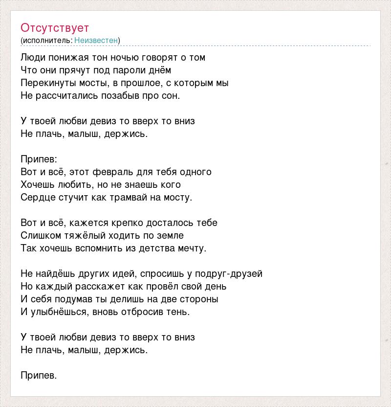 Люди понижая тон ночью говорят о том Что они прячут под пароли днём Перекинуты мосты, в прошлое, с которым мы Не рассчитались позабыв про сон. У твоей любви девиз то вверх то вниз Не плачь, малыш, держись. Припев: Вот и всё, этот февраль для тебя одного Хочешь любить, но не знаешь кого Сердце стучит как трамвай на мосту. Вот и всё, кажется крепко досталось тебе Слишком тяжёлый ходить по земле Так хочешь вспомнить из детства мечту. Не найдёшь других идей, спросишь у подруг-друзей Но каждый расскажет как провёл свой день И себя подумав ты делишь на две стороны И улыбнёшься, вновь отбросив тень. У твоей любви девиз то вверх то вниз Не плачь, малыш, держись. Припев.