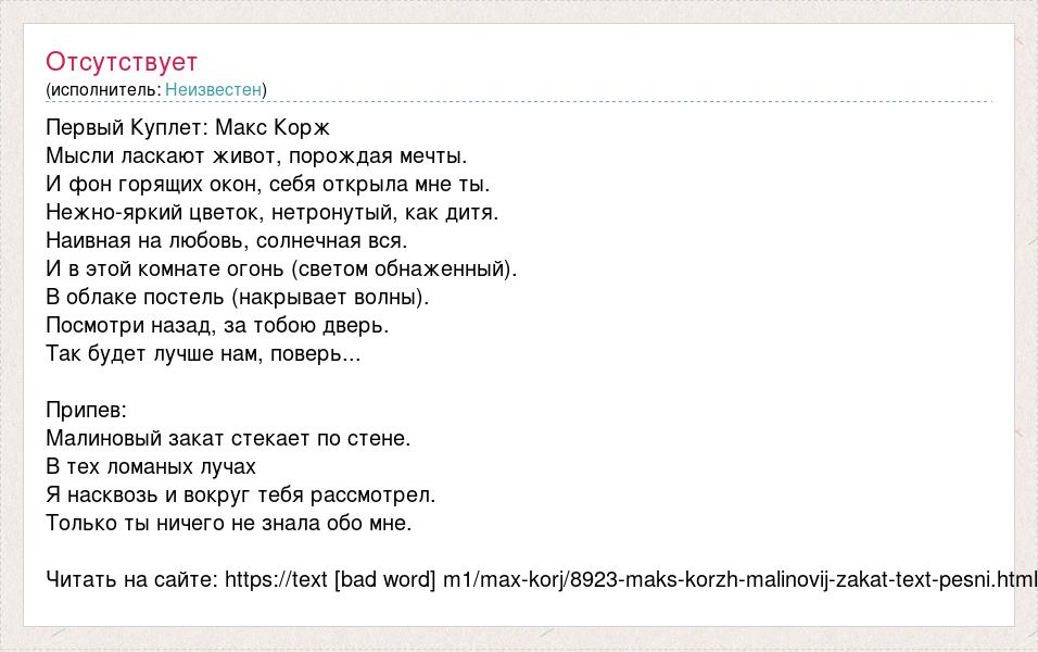 Первый Куплет: Макс Корж Мысли ласкают живот, порождая мечты. И фон горящих окон, себя открыла мне ты. Нежно-яркий цветок, нетронутый, как дитя. Наивная на любовь, солнечная вся. И в этой комнате огонь (светом обнаженный). В облаке постель (накрывает волны). Посмотри назад, за тобою дверь. Так будет лучше нам, поверь... Припев: Малиновый закат стекает по стене. В тех ломаных лучах Я насквозь и вокруг тебя рассмотрел. Только ты ничего не знала обо мне. Читать на сайте: https://text [bad word] m1/max-korj/8923-maks-korzh-malinovij-zakat-text-pesni.html