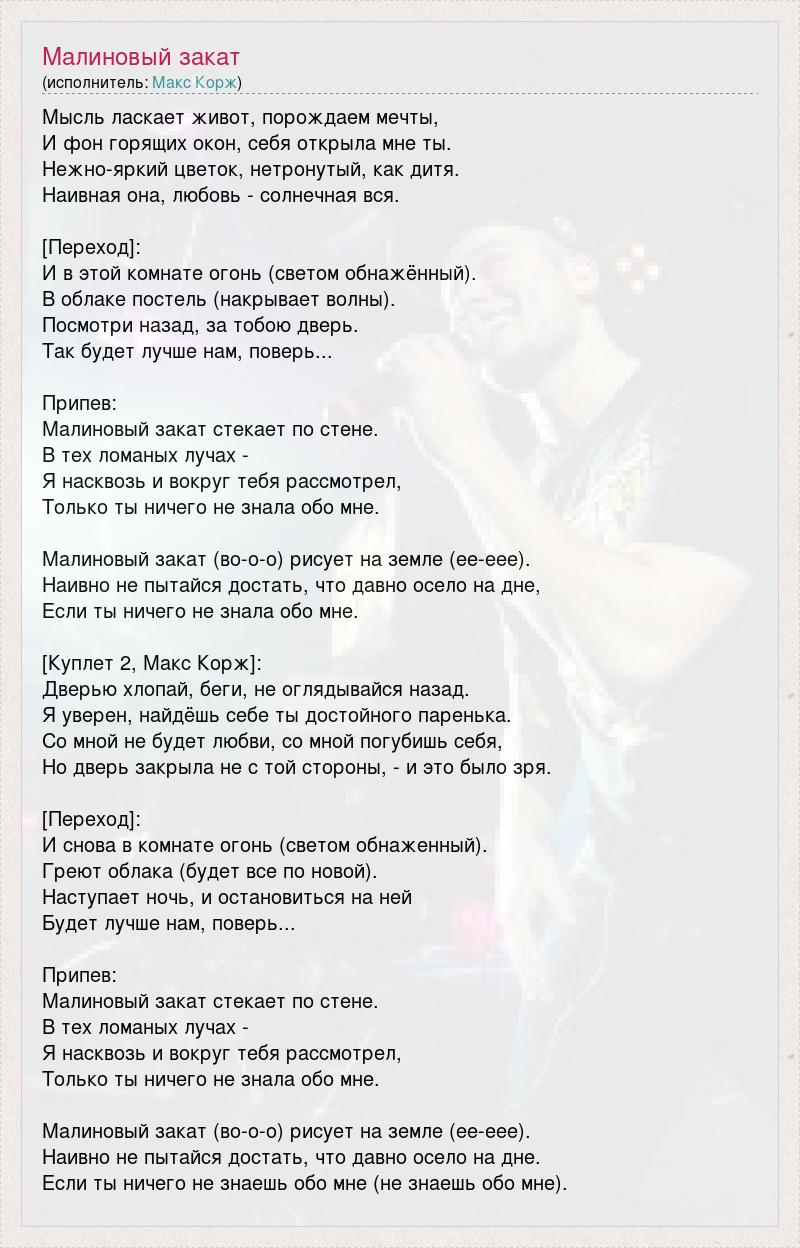 Мысль ласкает живот, порождаем мечты, И фон горящих окон, себя открыла мне ты. Нежно-яркий цветок, нетронутый, как дитя. Наивная она, любовь - солнечная вся. [Переход]: И в этой комнате огонь (светом обнажённый). В облаке постель (накрывает волны). Посмотри назад, за тобою дверь. Так будет лучше нам, поверь... Припев: Малиновый закат стекает по стене. В тех ломаных лучах - Я насквозь и вокруг тебя рассмотрел, Только ты ничего не знала обо мне. Малиновый закат (во-о-о) рисует на земле (ее-еее). Наивно не пытайся достать, что давно осело на дне, Если ты ничего не знала обо мне. [Куплет 2, Макс Корж]: Дверью хлопай, беги, не оглядывайся назад. Я уверен, найдёшь себе ты достойного паренька. Со мной не будет любви, со мной погубишь себя, Но дверь закрыла не с той стороны, - и это было зря. [Переход]: И снова в комнате огонь (светом обнаженный). Греют облака (будет все по новой). Наступает ночь, и остановиться на ней Будет лучше нам, поверь... Припев: Малиновый закат стекает по стене. В тех ломаных лучах - Я насквозь и вокруг тебя рассмотрел, Только ты ничего не знала обо мне. Малиновый закат (во-о-о) рисует на земле (ее-еее). Наивно не пытайся достать, что давно осело на дне. Если ты ничего не знаешь обо мне (не знаешь обо мне).