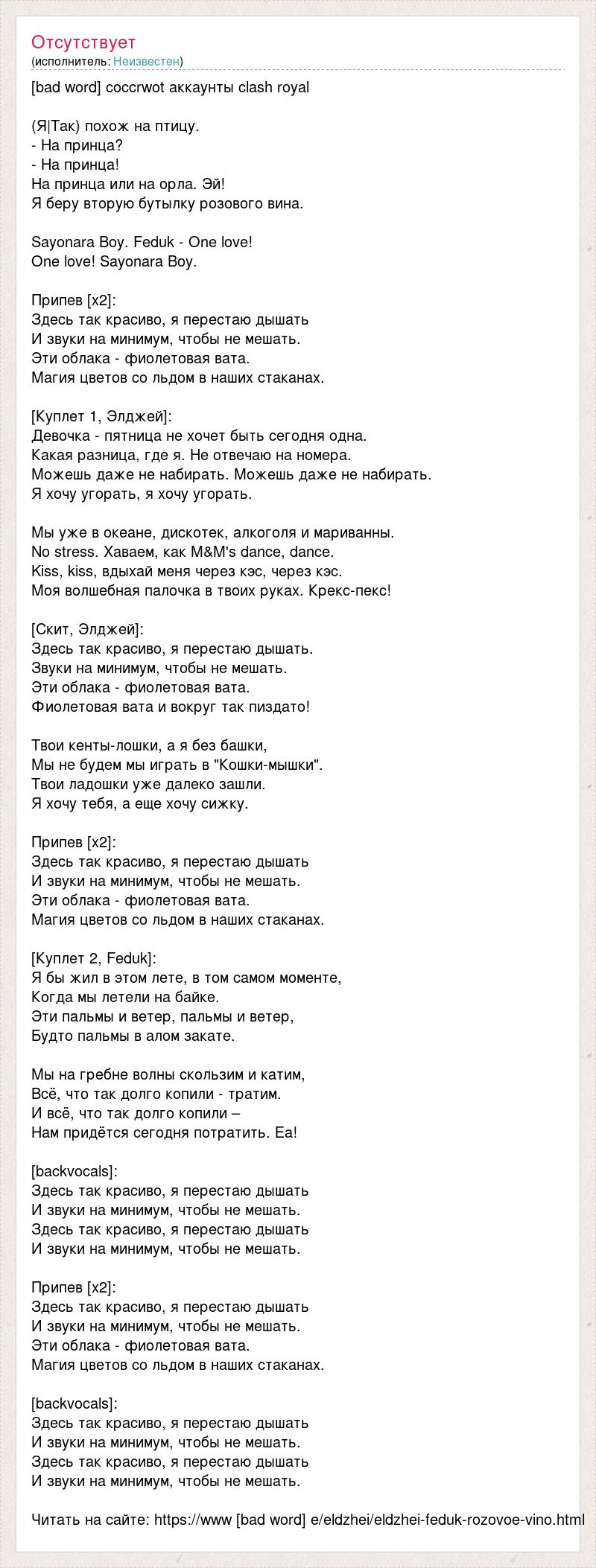 [bad word] coccrwot аккаунты clash royal (Я|Так) похож на птицу. - На принца? - На принца! На принца или на орла. Эй! Я беру вторую бутылку розового вина. Sayonara Boy. Feduk - One love! One love! Sayonara Boy. Припев [x2]: Здесь так красиво, я перестаю дышать И звуки на минимум, чтобы не мешать. Эти облака - фиолетовая вата. Магия цветов со льдом в наших стаканах. [Куплет 1, Элджей]: Девочка - пятница не хочет быть сегодня одна. Какая разница, где я. Не отвечаю на номера. Можешь даже не набирать. Можешь даже не набирать. Я хочу угорать, я хочу угорать. Мы уже в океане, дискотек, алкоголя и мариванны. No stress. Хаваем, как M&M's dance, dance. Kiss, kiss, вдыхай меня через кэс, через кэс. Моя волшебная палочка в твоих руках. Крекс-пекс! [Скит, Элджей]: Здесь так красиво, я перестаю дышать. Звуки на минимум, чтобы не мешать. Эти облака - фиолетовая вата. Фиолетовая вата и вокруг так пиздато! Твои кенты-лошки, а я без башки, Мы не будем мы играть в "Кошки-мышки". Твои ладошки уже далеко зашли. Я хочу тебя, а еще хочу сижку. Припев [x2]: Здесь так красиво, я перестаю дышать И звуки на минимум, чтобы не мешать. Эти облака - фиолетовая вата. Магия цветов со льдом в наших стаканах. [Куплет 2, Feduk]: Я бы жил в этом лете, в том самом моменте, Когда мы летели на байке. Эти пальмы и ветер, пальмы и ветер, Будто пальмы в алом закате. Мы на гребне волны скользим и катим, Всё, что так долго копили - тратим. И всё, что так долго копили – Нам придётся сегодня потратить. Еа! [backvocals]: Здесь так красиво, я перестаю дышать И звуки на минимум, чтобы не мешать. Здесь так красиво, я перестаю дышать И звуки на минимум, чтобы не мешать. Припев [x2]: Здесь так красиво, я перестаю дышать И звуки на минимум, чтобы не мешать. Эти облака - фиолетовая вата. Магия цветов со льдом в наших стаканах. [backvocals]: Здесь так красиво, я перестаю дышать И звуки на минимум, чтобы не мешать. Здесь так красиво, я перестаю дышать И звуки на минимум, чтобы не мешать. Читать на сайте: https://www [bad word] e/eldzhei/eldzhei-feduk-rozovoe-vino.html
