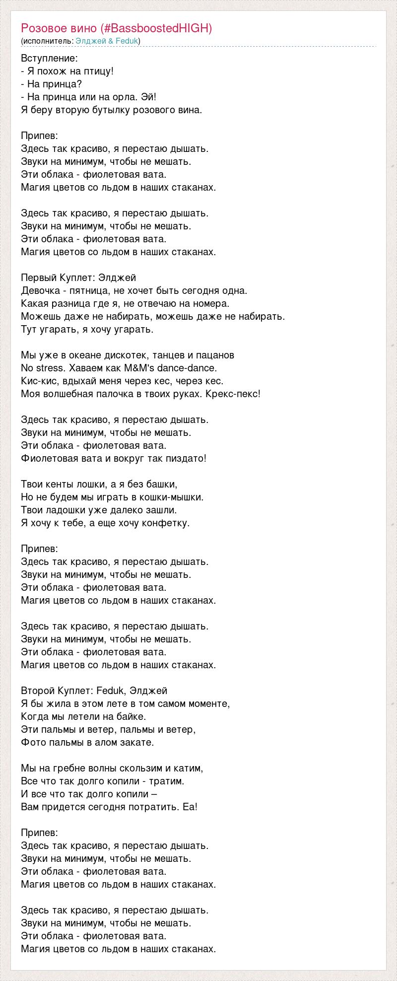 Вступление: - Я похож на птицу! - На принца? - На принца или на орла. Эй! Я беру вторую бутылку розового вина. Припев: Здесь так красиво, я перестаю дышать. Звуки на минимум, чтобы не мешать. Эти облака - фиолетовая вата. Магия цветов со льдом в наших стаканах. Здесь так красиво, я перестаю дышать. Звуки на минимум, чтобы не мешать. Эти облака - фиолетовая вата. Магия цветов со льдом в наших стаканах. Первый Куплет: Элджей Девочка - пятница, не хочет быть сегодня одна. Какая разница где я, не отвечаю на номера. Можешь даже не набирать, можешь даже не набирать. Тут угарать, я хочу угарать. Мы уже в океане дискотек, танцев и пацанов No stress. Хаваем как M&M's dance-dance. Кис-кис, вдыхай меня через кес, через кес. Моя волшебная палочка в твоих руках. Крекс-пекс! Здесь так красиво, я перестаю дышать. Звуки на минимум, чтобы не мешать. Эти облака - фиолетовая вата. Фиолетовая вата и вокруг так пиздато! Твои кенты лошки, а я без башки, Но не будем мы играть в кошки-мышки. Твои ладошки уже далеко зашли. Я хочу к тебе, а еще хочу конфетку. Припев: Здесь так красиво, я перестаю дышать. Звуки на минимум, чтобы не мешать. Эти облака - фиолетовая вата. Магия цветов со льдом в наших стаканах. Здесь так красиво, я перестаю дышать. Звуки на минимум, чтобы не мешать. Эти облака - фиолетовая вата. Магия цветов со льдом в наших стаканах. Второй Куплет: Feduk, Элджей Я бы жила в этом лете в том самом моменте, Когда мы летели на байке. Эти пальмы и ветер, пальмы и ветер, Фото пальмы в алом закате. Мы на гребне волны скользим и катим, Все что так долго копили - тратим. И все что так долго копили – Вам придется сегодня потратить. Еа! Припев: Здесь так красиво, я перестаю дышать. Звуки на минимум, чтобы не мешать. Эти облака - фиолетовая вата. Магия цветов со льдом в наших стаканах. Здесь так красиво, я перестаю дышать. Звуки на минимум, чтобы не мешать. Эти облака - фиолетовая вата. Магия цветов со льдом в наших стаканах.