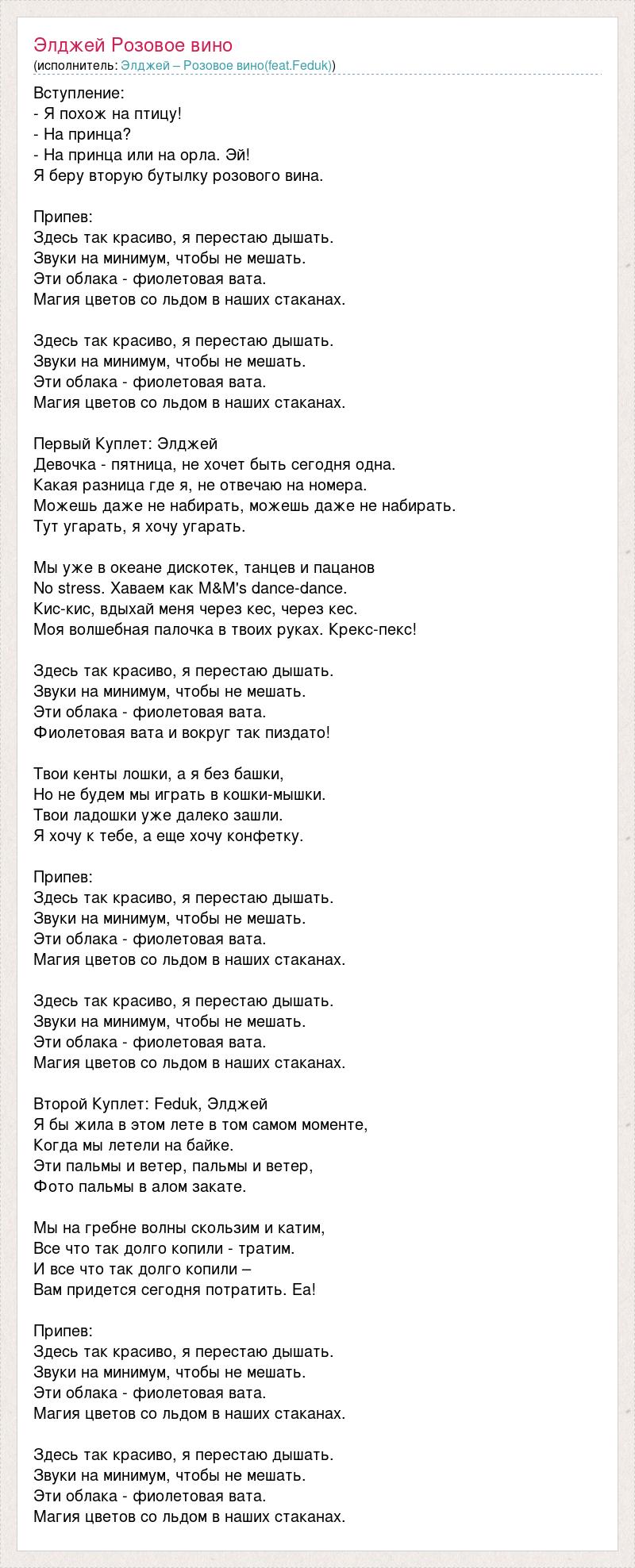 Вступление: - Я похож на птицу! - На принца? - На принца или на орла. Эй! Я беру вторую бутылку розового вина. Припев: Здесь так красиво, я перестаю дышать. Звуки на минимум, чтобы не мешать. Эти облака - фиолетовая вата. Магия цветов со льдом в наших стаканах. Здесь так красиво, я перестаю дышать. Звуки на минимум, чтобы не мешать. Эти облака - фиолетовая вата. Магия цветов со льдом в наших стаканах. Первый Куплет: Элджей Девочка - пятница, не хочет быть сегодня одна. Какая разница где я, не отвечаю на номера. Можешь даже не набирать, можешь даже не набирать. Тут угарать, я хочу угарать. Мы уже в океане дискотек, танцев и пацанов No stress. Хаваем как M&M's dance-dance. Кис-кис, вдыхай меня через кес, через кес. Моя волшебная палочка в твоих руках. Крекс-пекс! Здесь так красиво, я перестаю дышать. Звуки на минимум, чтобы не мешать. Эти облака - фиолетовая вата. Фиолетовая вата и вокруг так пиздато! Твои кенты лошки, а я без башки, Но не будем мы играть в кошки-мышки. Твои ладошки уже далеко зашли. Я хочу к тебе, а еще хочу конфетку. Припев: Здесь так красиво, я перестаю дышать. Звуки на минимум, чтобы не мешать. Эти облака - фиолетовая вата. Магия цветов со льдом в наших стаканах. Здесь так красиво, я перестаю дышать. Звуки на минимум, чтобы не мешать. Эти облака - фиолетовая вата. Магия цветов со льдом в наших стаканах. Второй Куплет: Feduk, Элджей Я бы жила в этом лете в том самом моменте, Когда мы летели на байке. Эти пальмы и ветер, пальмы и ветер, Фото пальмы в алом закате. Мы на гребне волны скользим и катим, Все что так долго копили - тратим. И все что так долго копили – Вам придется сегодня потратить. Еа! Припев: Здесь так красиво, я перестаю дышать. Звуки на минимум, чтобы не мешать. Эти облака - фиолетовая вата. Магия цветов со льдом в наших стаканах. Здесь так красиво, я перестаю дышать. Звуки на минимум, чтобы не мешать. Эти облака - фиолетовая вата. Магия цветов со льдом в наших стаканах.