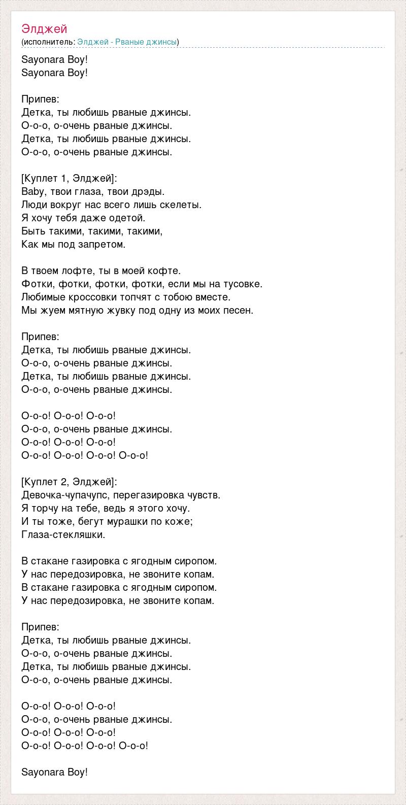 Sayonara Boy! Sayonara Boy! Припев: Детка, ты любишь рваные джинсы. О-о-о, о-очень рваные джинсы. Детка, ты любишь рваные джинсы. О-о-о, о-очень рваные джинсы. [Куплет 1, Элджей]: Baby, твои глаза, твои дрэды. Люди вокруг нас всего лишь скелеты. Я хочу тебя даже одетой. Быть такими, такими, такими, Как мы под запретом. В твоем лофте, ты в моей кофте. Фотки, фотки, фотки, фотки, если мы на тусовке. Любимые кроссовки топчят с тобою вместе. Мы жуем мятную жувку под одну из моих песен. Припев: Детка, ты любишь рваные джинсы. О-о-о, о-очень рваные джинсы. Детка, ты любишь рваные джинсы. О-о-о, о-очень рваные джинсы. О-о-о! О-о-о! О-о-о! О-о-о, о-очень рваные джинсы. О-о-о! О-о-о! О-о-о! О-о-о! О-о-о! О-о-о! О-о-о! [Куплет 2, Элджей]: Девочка-чупачупс, перегазировка чувств. Я торчу на тебе, ведь я этого хочу. И ты тоже, бегут мурашки по коже; Глаза-стекляшки. В стакане газировка с ягодным сиропом. У нас передозировка, не звоните копам. В стакане газировка с ягодным сиропом. У нас передозировка, не звоните копам. Припев: Детка, ты любишь рваные джинсы. О-о-о, о-очень рваные джинсы. Детка, ты любишь рваные джинсы. О-о-о, о-очень рваные джинсы. О-о-о! О-о-о! О-о-о! О-о-о, о-очень рваные джинсы. О-о-о! О-о-о! О-о-о! О-о-о! О-о-о! О-о-о! О-о-о! Sayonara Boy!