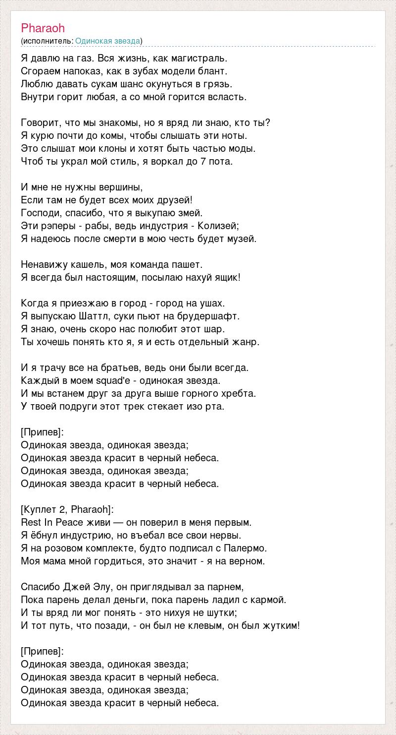 Я давлю на газ. Вся жизнь, как магистраль. Сгораем напоказ, как в зубах модели блант. Люблю давать сукам шанс окунуться в грязь. Внутри горит любая, а со мной горится всласть. Говорит, что мы знакомы, но я вряд ли знаю, кто ты? Я курю почти до комы, чтобы слышать эти ноты. Это слышат мои клоны и хотят быть частью моды. Чтоб ты украл мой стиль, я воркал до 7 пота. И мне не нужны вершины, Если там не будет всех моих друзей! Господи, спасибо, что я выкупаю змей. Эти рэперы - рабы, ведь индустрия - Колизей; Я надеюсь после смерти в мою честь будет музей. Ненавижу кашель, моя команда пашет. Я всегда был настоящим, посылаю нахуй ящик! Когда я приезжаю в город - город на ушах. Я выпускаю Шаттл, суки пьют на брудершафт. Я знаю, очень скоро нас полюбит этот шар. Ты хочешь понять кто я, я и есть отдельный жанр. И я трачу все на братьев, ведь они были всегда. Каждый в моем squad'е - одинокая звезда. И мы встанем друг за друга выше горного хребта. У твоей подруги этот трек стекает изо рта. [Припев]: Одинокая звезда, одинокая звезда; Одинокая звезда красит в черный небеса. Одинокая звезда, одинокая звезда; Одинокая звезда красит в черный небеса. [Куплет 2, Pharaoh]: Rest In Peace живи — он поверил в меня первым. Я ёбнул индустрию, но въебал все свои нервы. Я на розовом комплекте, будто подписал с Палермо. Моя мама мной гордиться, это значит - я на верном. Спасибо Джей Элу, он приглядывал за парнем, Пока парень делал деньги, пока парень ладил с кармой. И ты вряд ли мог понять - это нихуя не шутки; И тот путь, что позади, - он был не клевым, он был жутким! [Припев]: Одинокая звезда, одинокая звезда; Одинокая звезда красит в черный небеса. Одинокая звезда, одинокая звезда; Одинокая звезда красит в черный небеса.