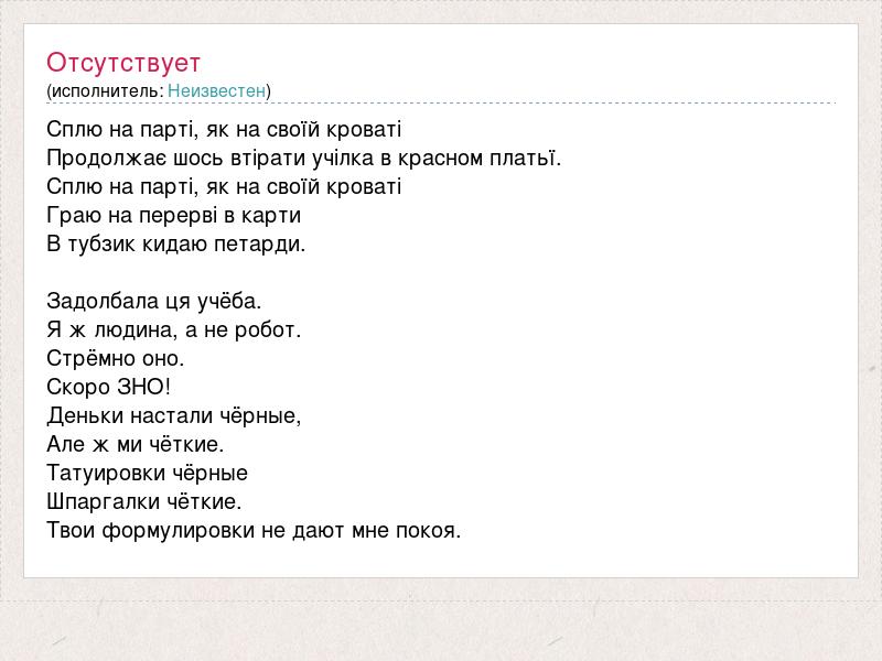 Сплю на партi, як на своїй кроватi Продолжає шось втiрати учiлка в красном платьї. Сплю на партi, як на своїй кроватi Граю на перервi в карти В тубзик кидаю петарди. Задолбала ця учёба. Я ж людина, а не робот. Стрёмно оно. Скоро ЗНО! Деньки настали чёрные, Але ж ми чёткие. Татуировки чёрные Шпаргалки чёткие. Твои формулировки не дают мне покоя.