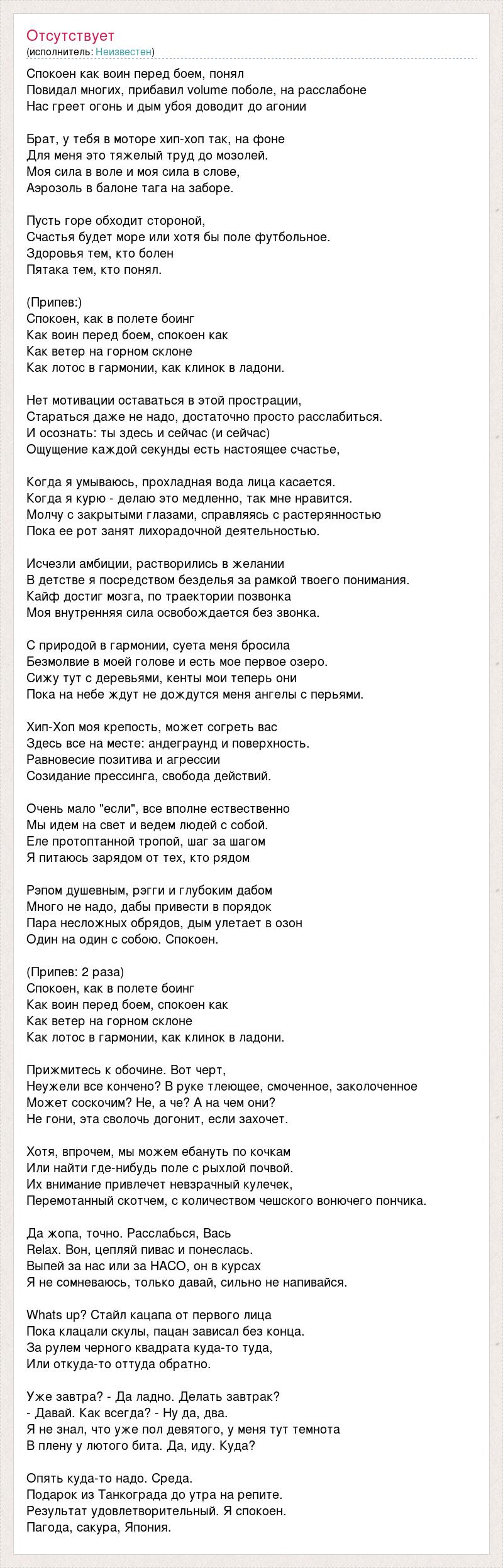 Спокоен как воин перед боем, понял Повидал многих, прибавил volume поболе, на расслабоне Нас греет огонь и дым убоя доводит до агонии Брат, у тебя в моторе хип-хоп так, на фоне Для меня это тяжелый труд до мозолей. Моя сила в воле и моя сила в слове, Аэрозоль в балоне тага на заборе. Пусть горе обходит стороной, Счастья будет море или хотя бы поле футбольное. Здоровья тем, кто болен Пятака тем, кто понял. (Припев:) Спокоен, как в полете боинг Как воин перед боем, спокоен как Как ветер на горном склоне Как лотос в гармонии, как клинок в ладони. Нет мотивации оставаться в этой прострации, Стараться даже не надо, достаточно просто расслабиться. И осознать: ты здесь и сейчас (и сейчас) Ощущение каждой секунды есть настоящее счастье, Когда я умываюсь, прохладная вода лица касается. Когда я курю - делаю это медленно, так мне нравится. Молчу с закрытыми глазами, справляясь с растерянностью Пока ее рот занят лихорадочной деятельностью. Исчезли амбиции, растворились в желании В детстве я посредством безделья за рамкой твоего понимания. Кайф достиг мозга, по траектории позвонка Моя внутренняя сила освобождается без звонка. С природой в гармонии, суета меня бросила Безмолвие в моей голове и есть мое первое озеро. Сижу тут с деревьями, кенты мои теперь они Пока на небе ждут не дождутся меня ангелы с перьями. Хип-Хоп моя крепость, может согреть вас Здесь все на месте: андеграунд и поверхность. Равновесие позитива и агрессии Созидание прессинга, свобода действий. Очень мало "если", все вполне ествественно Мы идем на свет и ведем людей с собой. Еле протоптанной тропой, шаг за шагом Я питаюсь зарядом от тех, кто рядом Рэпом душевным, рэгги и глубоким дабом Много не надо, дабы привести в порядок Пара несложных обрядов, дым улетает в озон Один на один с собою. Спокоен. (Припев: 2 раза) Спокоен, как в полете боинг Как воин перед боем, спокоен как Как ветер на горном склоне Как лотос в гармонии, как клинок в ладони. Прижмитесь к обочине. Вот черт, Неужели все кончено? В руке тлеющее, смоченное, заколоченное Может соскочим? Не, а че? А на чем они? Не гони, эта сволочь догонит, если захочет. Хотя, впрочем, мы можем ебануть по кочкам Или найти где-нибудь поле с рыхлой почвой. Их внимание привлечет невзрачный кулечек, Перемотанный скотчем, с количеством чешского вонючего пончика. Да жопа, точно. Расслабься, Вась Relax. Вон, цепляй пивас и понеслась. Выпей за нас или за НАСО, он в курсах Я не сомневаюсь, только давай, сильно не напивайся. Whats up? Стайл кацапа от первого лица Пока клацали скулы, пацан зависал без конца. За рулем черного квадрата куда-то туда, Или откуда-то оттуда обратно. Уже завтра? - Да ладно. Делать завтрак? - Давай. Как всегда? - Ну да, два. Я не знал, что уже пол девятого, у меня тут темнота В плену у лютого бита. Да, иду. Куда? Опять куда-то надо. Среда. Подарок из Танкограда до утра на репите. Результат удовлетворительный. Я спокоен. Пагода, сакура, Япония.