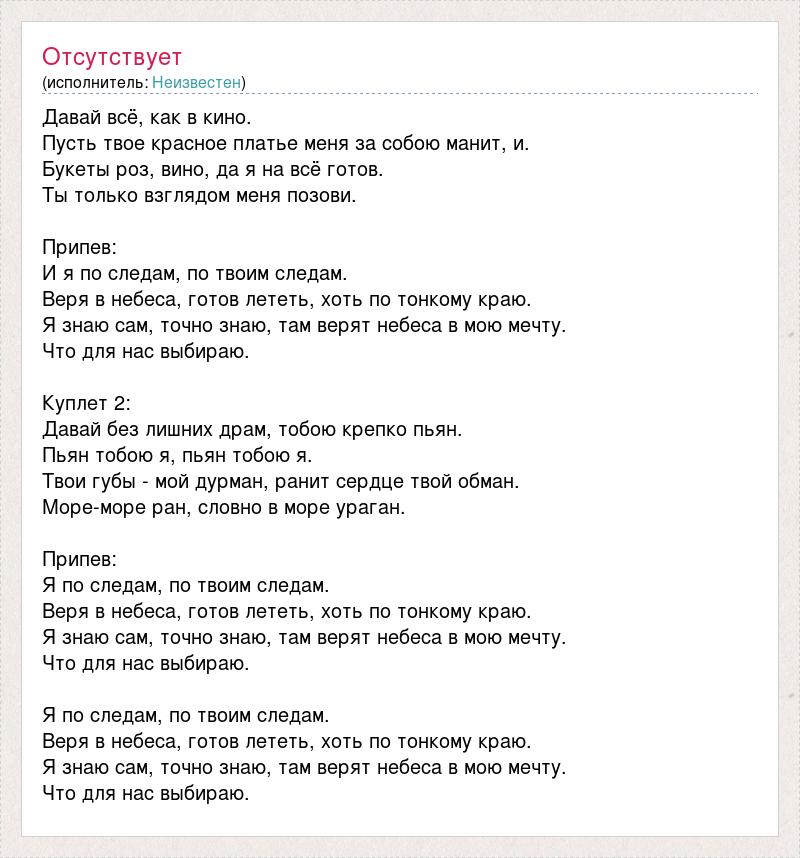 Давай всё, как в кино. Пусть твое красное платье меня за собою манит, и. Букеты роз, вино, да я на всё готов. Ты только взглядом меня позови. Припев: И я по следам, по твоим следам. Веря в небеса, готов лететь, хоть по тонкому краю. Я знаю сам, точно знаю, там верят небеса в мою мечту. Что для нас выбираю. Куплет 2: Давай без лишних драм, тобою крепко пьян. Пьян тобою я, пьян тобою я. Твои губы - мой дурман, ранит сердце твой обман. Море-море ран, словно в море ураган. Припев: Я по следам, по твоим следам. Веря в небеса, готов лететь, хоть по тонкому краю. Я знаю сам, точно знаю, там верят небеса в мою мечту. Что для нас выбираю. Я по следам, по твоим следам. Веря в небеса, готов лететь, хоть по тонкому краю. Я знаю сам, точно знаю, там верят небеса в мою мечту. Что для нас выбираю.