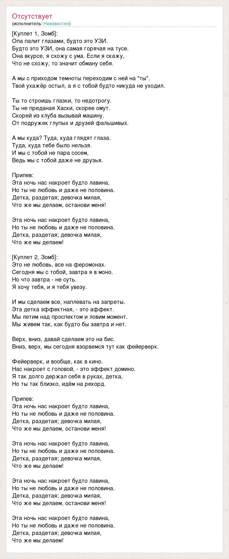 [Куплет 1, Зомб]: Опа палит глазами, будто это УЗИ. Будто это УЗИ, она самая горячая на тусе. Она вкурсе, я схожу с ума. Если я скажу, Что не схожу, то значит обману себя. А мы с приходом темноты переходим с ней на "ты". Твой ухажёр остыл, а я с тобой будто никуда не уходил. Ты то строишь глазки, то недотрогу. Ты не преданая Хаски, скорее омут. Скорей из клуба вызывай машину. От подружек глупых и друзей фальшивых. А мы куда? Туда, куда глядят глаза. Туда, куда тебе было нельзя. И мы с тобой не пара сосем, Ведь мы с тобой даже не друзья. Припев: Эта ночь нас накроет будто лавина, Но ты не любовь и даже не половина. Детка, раздетая; девочка милая, Что же мы делаем, останови меня! Эта ночь нас накроет будто лавина, Но ты не любовь и даже не половина. Детка, раздетая; девочка милая, Что же мы делаем! [Куплет 2, Зомб]: Это не любовь, все на феромонах. Сегодня мы с тобой, завтра я в моно. Но что завтра - не суть. Я хочу тебя, и я тебя увезу. И мы сделаем все, наплевать на запреты. Эта детка эффектная, - это аффект. Мы летим над проспектом и ловим момент. Мы живем так, как будто бы завтра и нет. Верх, вниз, давай сделаем это на бис. Вниз, верх, мы сегодня взорвемся тут как фейерверк. Фейерверк, и вообще, как в кино. Нас накроет с головой, - это эффект домино. Я так долго держал себя в руках, детка, Но ты так близко, идём на рекорд. Припев: Эта ночь нас накроет будто лавина, Но ты не любовь и даже не половина. Детка, раздетая; девочка милая, Что же мы делаем, останови меня! Эта ночь нас накроет будто лавина, Но ты не любовь и даже не половина. Детка, раздетая; девочка милая, Что же мы делаем! Эта ночь нас накроет будто лавина, Но ты не любовь и даже не половина. Детка, раздетая; девочка милая, Что же мы делаем, останови меня! Эта ночь нас накроет будто лавина, Но ты не любовь и даже не половина. Детка, раздетая; девочка милая, Что же мы делаем!