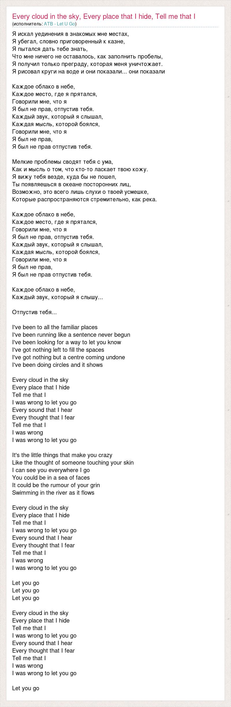 Я искал уединения в знакомых мне местах, Я убегал, словно приговоренный к казне, Я пытался дать тебе знать, Что мне ничего не оставалось, как заполнить пробелы, Я получил только преграду, которая меня уничтожает. Я рисовал круги на воде и они показали... они показали Каждое облако в небе, Каждое место, где я прятался, Говорили мне, что я Я был не прав, отпустив тебя. Каждый звук, который я слышал, Каждая мысль, которой боялся, Говорили мне, что я Я был не прав, Я был не прав отпустив тебя. Мелкие проблемы сводят тебя с ума, Как и мысль о том, что кто-то ласкает твою кожу. Я вижу тебя везде, куда бы не пошел, Ты появляешься в океане посторонних лиц, Возможно, это всего лишь слухи о твоей усмешке, Которые распространяются стремительно, как река. Каждое облако в небе, Каждое место, где я прятался, Говорили мне, что я Я был не прав, отпустив тебя. Каждый звук, который я слышал, Каждая мысль, которой боялся, Говорили мне, что я Я был не прав, Я был не прав отпустив тебя. Каждое облако в небе, Каждый звук, который я слышу... Отпустив тебя... I've been to all the familiar places I've been running like a sentence never begun I've been looking for a way to let you know I've got nothing left to fill the spaces I've got nothing but a centre coming undone I've been doing circles and it shows Every cloud in the sky Every place that I hide Tell me that I I was wrong to let you go Every sound that I hear Every thought that I fear Tell me that I I was wrong I was wrong to let you go It's the little things that make you crazy Like the thought of someone touching your skin I can see you everywhere I go You could be in a sea of faces It could be the rumour of your grin Swimming in the river as it flows Every cloud in the sky Every place that I hide Tell me that I I was wrong to let you go Every sound that I hear Every thought that I fear Tell me that I I was wrong I was wrong to let you go Let you go Let you go Let you go Every cloud in the sky Every place that I hide Tell me that I I was wrong to let you go Every sound that I hear Every thought that I fear Tell me that I I was wrong I was wrong to let you go Let you go