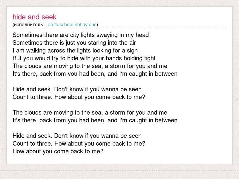 Sometimes there are city lights swaying in my head Sometimes there is just you staring into the air I am walking across the lights looking for a sign But you would try to hide with your hands holding tight The clouds are moving to the sea, a storm for you and me It's there, back from you had been, and I'm caught in between Hide and seek. Don't know if you wanna be seen Count to three. How about you come back to me? The clouds are moving to the sea, a storm for you and me It's there, back from you had been, and I'm caught in between Hide and seek. Don't know if you wanna be seen Count to three. How about you come back to me? How about you come back to me?