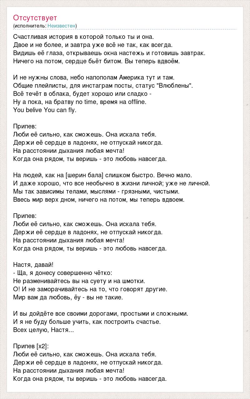 Счастливая история в которой только ты и она. Двое и не более, и завтра уже всё не так, как всегда. Видишь её глаза, открываешь окна настежь и готовишь завтрак. Ничего на потом, сердце бьёт битом. Вы теперь вдвоём. И не нужны слова, небо напополам Америка тут и там. Общие плейлисты, для инстаграм посты, статус "Влюблены". Всё течёт в облака, будет хорошо или сладко - Ну а пока, на братву no time, время на offline. You belive You can fly. Припев: Люби её сильно, как сможешь. Она искала тебя. Держи её сердце в ладонях, не отпускай никогда. На расстоянии дыхания любая мечта! Когда она рядом, ты веришь - это любовь навсегда. На людей, как на [шерин бала] слишком быстро. Вечно мало. И даже хорошо, что все необычно в жизни личной; уже не личной. Мы так зависимы телами, мыслями - грязными, чистыми. Ввесь мир верх дном, ничего на потом, мы теперь вдвоем. Припев: Люби её сильно, как сможешь. Она искала тебя. Держи её сердце в ладонях, не отпускай никогда. На расстоянии дыхания любая мечта! Когда она рядом, ты веришь - это любовь навсегда. Настя, давай! - Ща, я донесу совершенно чётко: Не разменивайтесь вы на суету и на шмотки. О! И не заморачивайтесь на то, что говорят другие. Мир вам да любовь, ёу - вы не такие. И вы дойдёте все своими дорогами, простыми и сложными. И я не буду больше учить, как построить счастье. Всех целую, Настя... Припев [x2]: Люби её сильно, как сможешь. Она искала тебя. Держи её сердце в ладонях, не отпускай никогда. На расстоянии дыхания любая мечта! Когда она рядом, ты веришь - это любовь навсегда.