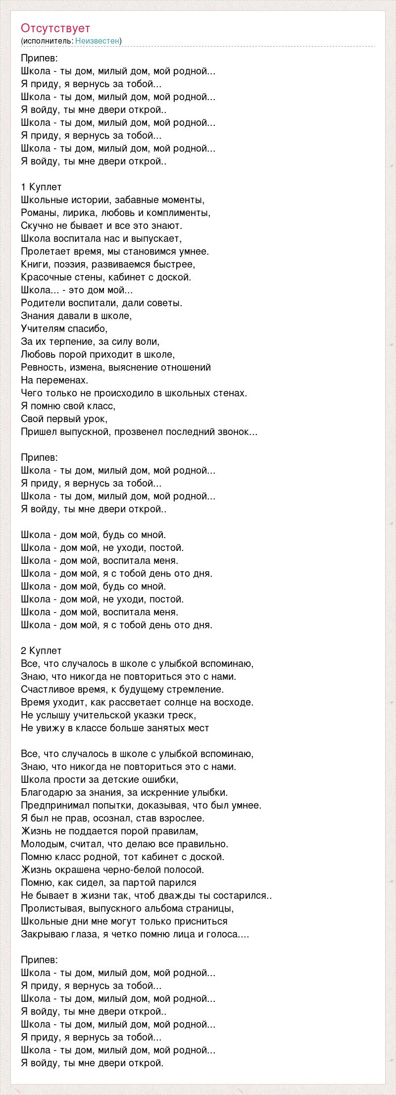 Припев: Школа - ты дом, милый дом, мой родной... Я приду, я вернусь за тобой... Школа - ты дом, милый дом, мой родной... Я войду, ты мне двери открой.. Школа - ты дом, милый дом, мой родной... Я приду, я вернусь за тобой... Школа - ты дом, милый дом, мой родной... Я войду, ты мне двери открой.. 1 Куплет Школьные истории, забавные моменты, Романы, лирика, любовь и комплименты, Скучно не бывает и все это знают. Школа воспитала нас и выпускает, Пролетает время, мы становимся умнее. Книги, поэзия, развиваемся быстрее, Красочные стены, кабинет с доской. Школа... - это дом мой... Родители воспитали, дали советы. Знания давали в школе, Учителям спасибо, За их терпение, за силу воли, Любовь порой приходит в школе, Ревность, измена, выяснение отношений На переменах. Чего только не происходило в школьных стенах. Я помню свой класс, Свой первый урок, Пришел выпускной, прозвенел последний звонок... Припев: Школа - ты дом, милый дом, мой родной... Я приду, я вернусь за тобой... Школа - ты дом, милый дом, мой родной... Я войду, ты мне двери открой.. Школа - дом мой, будь со мной. Школа - дом мой, не уходи, постой. Школа - дом мой, воспитала меня. Школа - дом мой, я с тобой день ото дня. Школа - дом мой, будь со мной. Школа - дом мой, не уходи, постой. Школа - дом мой, воспитала меня. Школа - дом мой, я с тобой день ото дня. 2 Куплет Все, что случалось в школе с улыбкой вспоминаю, Знаю, что никогда не повториться это с нами. Счастливое время, к будущему стремление. Время уходит, как рассветает солнце на восходе. Не услышу учительской указки треск, Не увижу в классе больше занятых мест Все, что случалось в школе с улыбкой вспоминаю, Знаю, что никогда не повториться это с нами. Школа прости за детские ошибки, Благодарю за знания, за искренние улыбки. Предпринимал попытки, доказывая, что был умнее. Я был не прав, осознал, став взрослее. Жизнь не поддается порой правилам, Молодым, считал, что делаю все правильно. Помню класс родной, тот кабинет с доской. Жизнь окрашена черно-белой полосой. Помню, как сидел, за партой парился Не бывает в жизни так, чтоб дважды ты состарился.. Пролистывая, выпускного альбома страницы, Школьные дни мне могут только присниться Закрываю глаза, я четко помню лица и голоса.... Припев: Школа - ты дом, милый дом, мой родной... Я приду, я вернусь за тобой... Школа - ты дом, милый дом, мой родной... Я войду, ты мне двери открой.. Школа - ты дом, милый дом, мой родной... Я приду, я вернусь за тобой... Школа - ты дом, милый дом, мой родной... Я войду, ты мне двери открой.