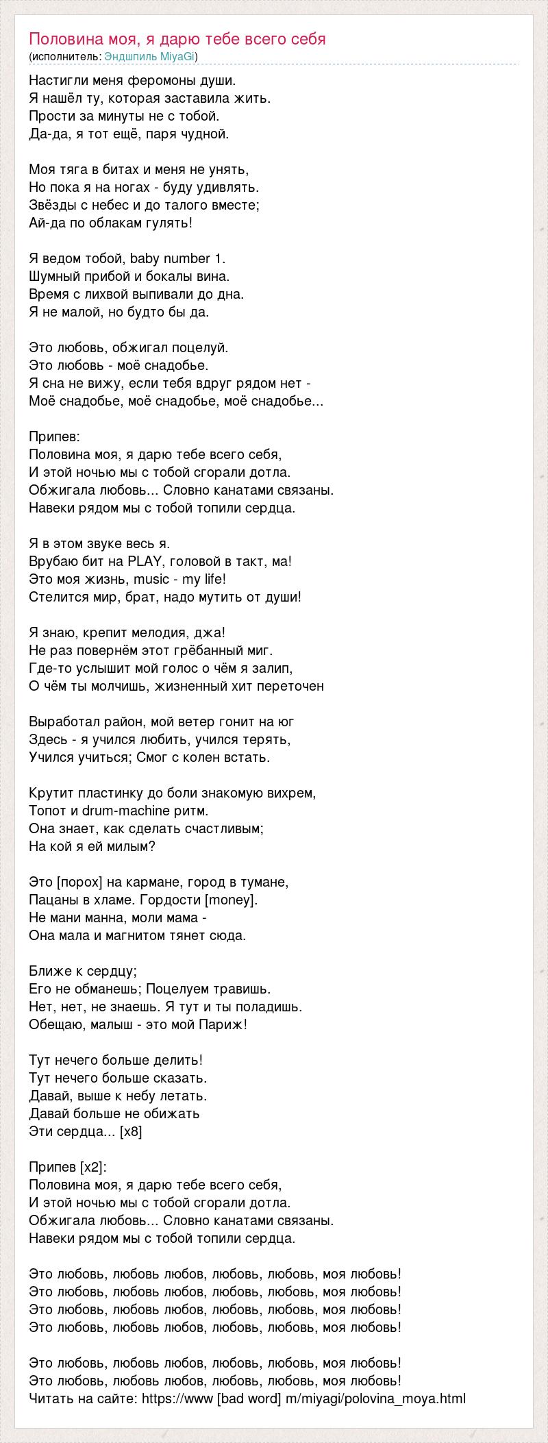 Настигли меня феромоны души. Я нашёл ту, которая заставила жить. Прости за минуты не с тобой. Да-да, я тот ещё, паря чудной. Моя тяга в битах и меня не унять, Но пока я на ногах - буду удивлять. Звёзды с небес и до талого вместе; Ай-да по облакам гулять! Я ведом тобой, baby number 1. Шумный прибой и бокалы вина. Время с лихвой выпивали до дна. Я не малой, но будто бы да. Это любовь, обжигал поцелуй. Это любовь - моё снадобье. Я сна не вижу, если тебя вдруг рядом нет - Моё снадобье, моё снадобье, моё снадобье... Припев: Половина моя, я дарю тебе всего себя, И этой ночью мы с тобой сгорали дотла. Обжигала любовь... Словно канатами связаны. Навеки рядом мы с тобой топили сердца. Я в этом звуке весь я. Врубаю бит на PLAY, головой в такт, ма! Это моя жизнь, music - my life! Стелится мир, брат, надо мутить от души! Я знаю, крепит мелодия, джа! Не раз повернём этот грёбанный миг. Где-то услышит мой голос о чём я залип, О чём ты молчишь, жизненный хит переточен Выработал район, мой ветер гонит на юг Здесь - я учился любить, учился терять, Учился учиться; Смог с колен встать. Крутит пластинку до боли знакомую вихрем, Топот и drum-machine ритм. Она знает, как сделать счастливым; На кой я ей милым? Это [порох] на кармане, город в тумане, Пацаны в хламе. Гордости [money]. Не мани манна, моли мама - Она мала и магнитом тянет сюда. Ближе к сердцу; Его не обманешь; Поцелуем травишь. Нет, нет, не знаешь. Я тут и ты поладишь. Обещаю, малыш - это мой Париж! Тут нечего больше делить! Тут нечего больше сказать. Давай, выше к небу летать. Давай больше не обижать Эти сердца... [x8] Припев [x2]: Половина моя, я дарю тебе всего себя, И этой ночью мы с тобой сгорали дотла. Обжигала любовь... Словно канатами связаны. Навеки рядом мы с тобой топили сердца. Это любовь, любовь любов, любовь, любовь, моя любовь! Это любовь, любовь любов, любовь, любовь, моя любовь! Это любовь, любовь любов, любовь, любовь, моя любовь! Это любовь, любовь любов, любовь, любовь, моя любовь! Это любовь, любовь любов, любовь, любовь, моя любовь! Это любовь, любовь любов, любовь, любовь, моя любовь! Читать на сайте: https://www [bad word] m/miyagi/polovina_moya.html