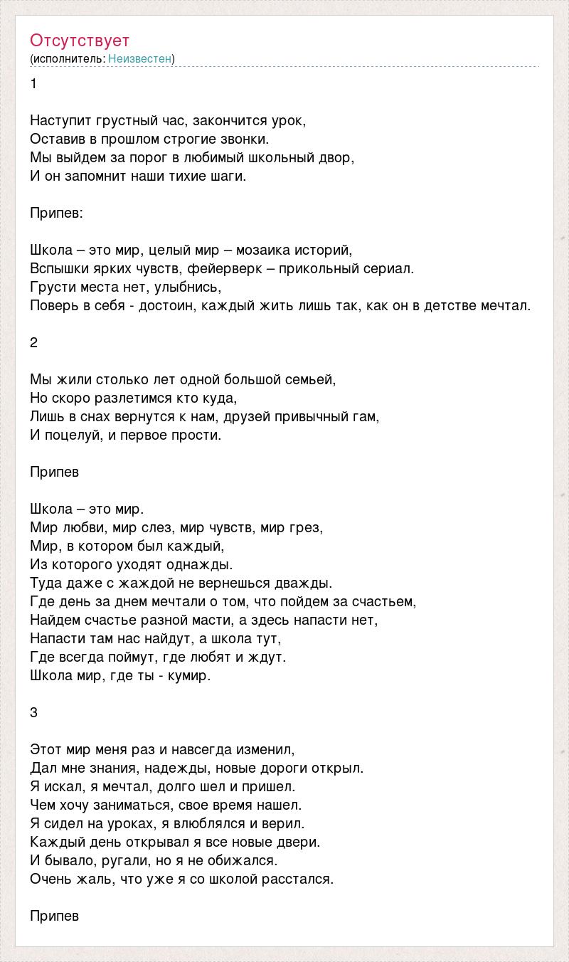 1 Наступит грустный час, закончится урок, Оставив в прошлом строгие звонки. Мы выйдем за порог в любимый школьный двор, И он запомнит наши тихие шаги. Припев: Школа – это мир, целый мир – мозаика историй, Вспышки ярких чувств, фейерверк – прикольный сериал. Грусти места нет, улыбнись, Поверь в себя - достоин, каждый жить лишь так, как он в детстве мечтал. 2 Мы жили столько лет одной большой семьей, Но скоро разлетимся кто куда, Лишь в снах вернутся к нам, друзей привычный гам, И поцелуй, и первое прости. Припев Школа – это мир. Мир любви, мир слез, мир чувств, мир грез, Мир, в котором был каждый, Из которого уходят однажды. Туда даже с жаждой не вернешься дважды. Где день за днем мечтали о том, что пойдем за счастьем, Найдем счастье разной масти, а здесь напасти нет, Напасти там нас найдут, а школа тут, Где всегда поймут, где любят и ждут. Школа мир, где ты - кумир. 3 Этот мир меня раз и навсегда изменил, Дал мне знания, надежды, новые дороги открыл. Я искал, я мечтал, долго шел и пришел. Чем хочу заниматься, свое время нашел. Я сидел на уроках, я влюблялся и верил. Каждый день открывал я все новые двери. И бывало, ругали, но я не обижался. Очень жаль, что уже я со школой расстался. Припев