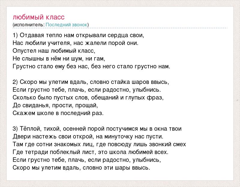 1) Отдавая тепло нам открывали сердца свои, Нас любили учителя, нас жалели порой они. Опустел наш любимый класс, Не слышны в нём ни шум, ни гам, Грустно стало ему без нас, без него стало грустно нам. 2) Скоро мы улетим вдаль, словно стайка шаров ввысь, Если грустно тебе, плачь, если радостно, улыбнись. Сколько было пустых слов, обещаний и глупых фраз, До свиданья, прости, прощай, Скажем школе в последний раз. 3) Тёплой, тихой, осенней порой постучимся мы в окна твои Двери настежь свои открой, на минуточку нас пусти. Там где сотни знакомых лиц, где повсюду лишь звонкий смех Где тетради поблеклый лист, это школа любимей всех. Если грустно тебе, плачь, если радостно, улыбнись, Скоро мы улетим вдаль, словно эти шары ввысь.