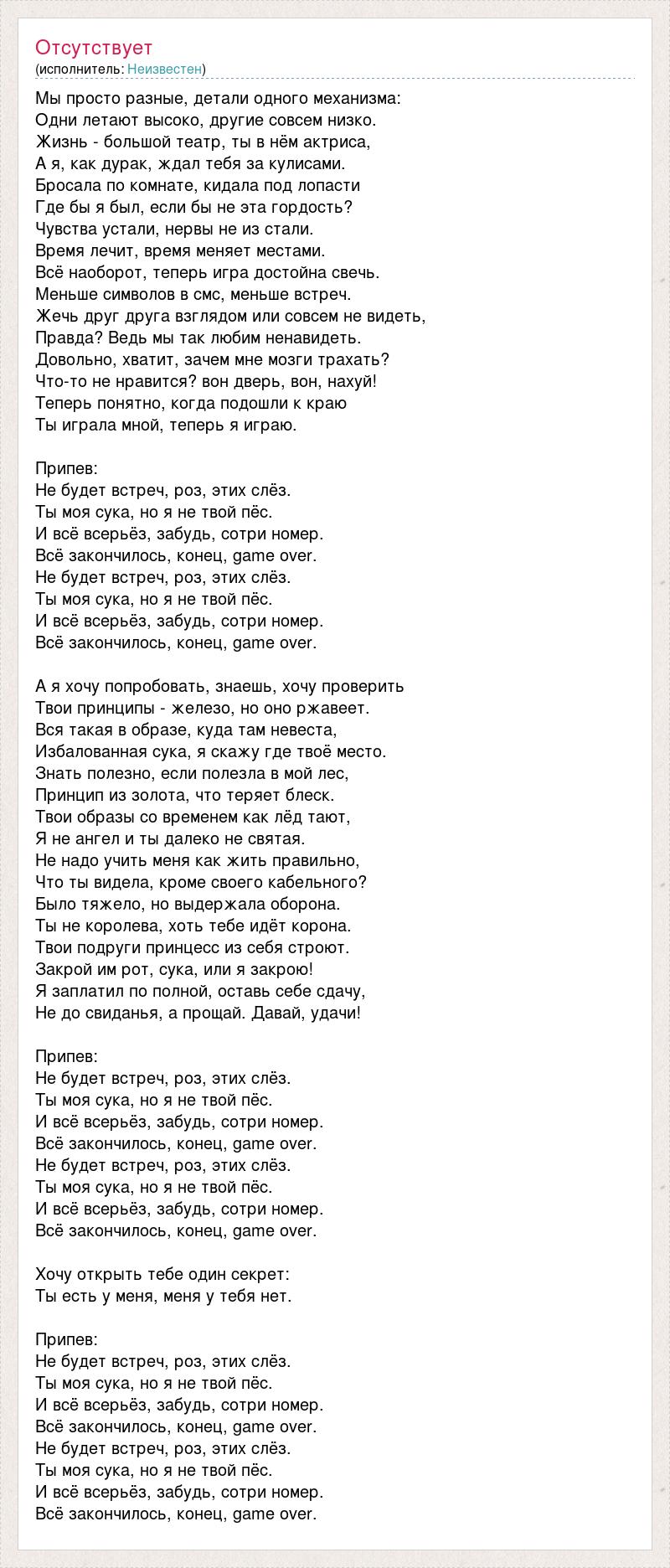 Мы просто разные, детали одного механизма: Одни летают высоко, другие совсем низко. Жизнь - большой театр, ты в нём актриса, А я, как дурак, ждал тебя за кулисами. Бросала по комнате, кидала под лопасти Где бы я был, если бы не эта гордость? Чувства устали, нервы не из стали. Время лечит, время меняет местами. Всё наоборот, теперь игра достойна свечь. Меньше символов в смс, меньше встреч. Жечь друг друга взглядом или совсем не видеть, Правда? Ведь мы так любим ненавидеть. Довольно, хватит, зачем мне мозги трахать? Что-то не нравится? вон дверь, вон, нахуй! Теперь понятно, когда подошли к краю Ты играла мной, теперь я играю. Припев: Не будет встреч, роз, этих слёз. Ты моя сука, но я не твой пёс. И всё всерьёз, забудь, сотри номер. Всё закончилось, конец, game over. Не будет встреч, роз, этих слёз. Ты моя сука, но я не твой пёс. И всё всерьёз, забудь, сотри номер. Всё закончилось, конец, game over. А я хочу попробовать, знаешь, хочу проверить Твои принципы - железо, но оно ржавеет. Вся такая в образе, куда там невеста, Избалованная сука, я скажу где твоё место. Знать полезно, если полезла в мой лес, Принцип из золота, что теряет блеск. Твои образы со временем как лёд тают, Я не ангел и ты далеко не святая. Не надо учить меня как жить правильно, Что ты видела, кроме своего кабельного? Было тяжело, но выдержала оборона. Ты не королева, хоть тебе идёт корона. Твои подруги принцесс из себя строют. Закрой им рот, сука, или я закрою! Я заплатил по полной, оставь себе сдачу, Не до свиданья, а прощай. Давай, удачи! Припев: Не будет встреч, роз, этих слёз. Ты моя сука, но я не твой пёс. И всё всерьёз, забудь, сотри номер. Всё закончилось, конец, game over. Не будет встреч, роз, этих слёз. Ты моя сука, но я не твой пёс. И всё всерьёз, забудь, сотри номер. Всё закончилось, конец, game over. Хочу открыть тебе один секрет: Ты есть у меня, меня у тебя нет. Припев: Не будет встреч, роз, этих слёз. Ты моя сука, но я не твой пёс. И всё всерьёз, забудь, сотри номер. Всё закончилось, конец, game over. Не будет встреч, роз, этих слёз. Ты моя сука, но я не твой пёс. И всё всерьёз, забудь, сотри номер. Всё закончилось, конец, game over.