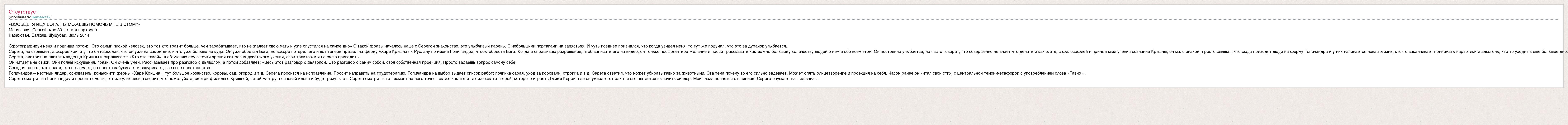 «ВООБЩЕ, Я ИЩУ БОГА. ТЫ МОЖЕШЬ ПОМОЧЬ МНЕ В ЭТОМ?» Меня зовут Сергей, мне 30 лет и я наркоман. Казахстан, Балхаш, Шушубай, июль 2014 Сфотографируй меня и подпиши потом: «Это самый плохой человек, это тот кто тратит больше, чем зарабатывает, кто не жалеет свою мать и уже опустился на самое дно» С такой фразы началось наше с Серегой знакомство, это улыбчивый парень. С небольшими портаками на запястьях. И чуть позднее признался, что когда увидел меня, то тут же подумал, что это за дурачок улыбается.. Серега, не скрывает, а скорее кричит, что он наркоман, что он уже на самом дне, и что уже больше не куда. Он уже обретал Бога, но вскоре потерял его и вот теперь пришел на ферму «Харе Кришна» к Руслану по имени Гопичандра, чтобы обрести Бога. Когда я спрашиваю разрешения, чтоб записать его на видео, он только поощряет мое желание и просит рассказать как можно большому количеству людей о нем и обо всем этом. Он постоянно улыбается, но часто говорит, что совершенно не знает что делать и как жить, с философией и принципами учения сознания Кришны, он мало знаком, просто слышал, что сюда приходят люди на ферму Гопичандра и у них начинается новая жизнь, кто-то заканчивает принимать наркотики и алкоголь, кто то уходит в еще большее дно. Серега, смотрит на плакат младенца Кришны и спрашивает: «Кто это такой», я объясняю ему с точки зрения как раз индуистского учения, свои трактовки я не смею приводить. Он читает мне стихи. Они полны искушения, грязи. Он очень умен. Рассказывает про разговор с дьяволом, а потом добавляет: «Весь этот разговор с дьяволом. Это разговор с самим собой, своя собственная проекция. Просто задаешь вопрос самому себе» Сегодня он под алкоголем, его не ломает, он просто забухивает и закуривает, все свое пространство. Гопичандра – местный лидер, основатель, комьюнити фермы «Харе Кришна», тут большое хозяйство, коровы, сад, огород и т.д. Серега просится на исправление. Просит направить на трудотерапию. Гопичандра на выбор выдает список работ: починка сарая, уход за коровами, стройка и т.д. Серега ответил, что может убирать гавно за животными. Эта тема почему то его сильно задевает. Может опять олицетворение и проекция на себя. Часом ранее он читал свой стих, с центральной темой-метафорой с употреблением слова «Гавно».. Серега смотрит на Гопичандру и просит помощи, тот же улыбаясь, говорит, что пожалуйста, смотри фильмы с Кришной, читай мантру, поспевай имена и будет результат. Серега смотрит в тот момент на него точно так же как и я и так же как тот герой, которого играет Джимм Керри, где он умирает от рака и его пытается вылечить хиллер. Мои глаза полнятся отчаянием, Серега опускает взгляд вниз….