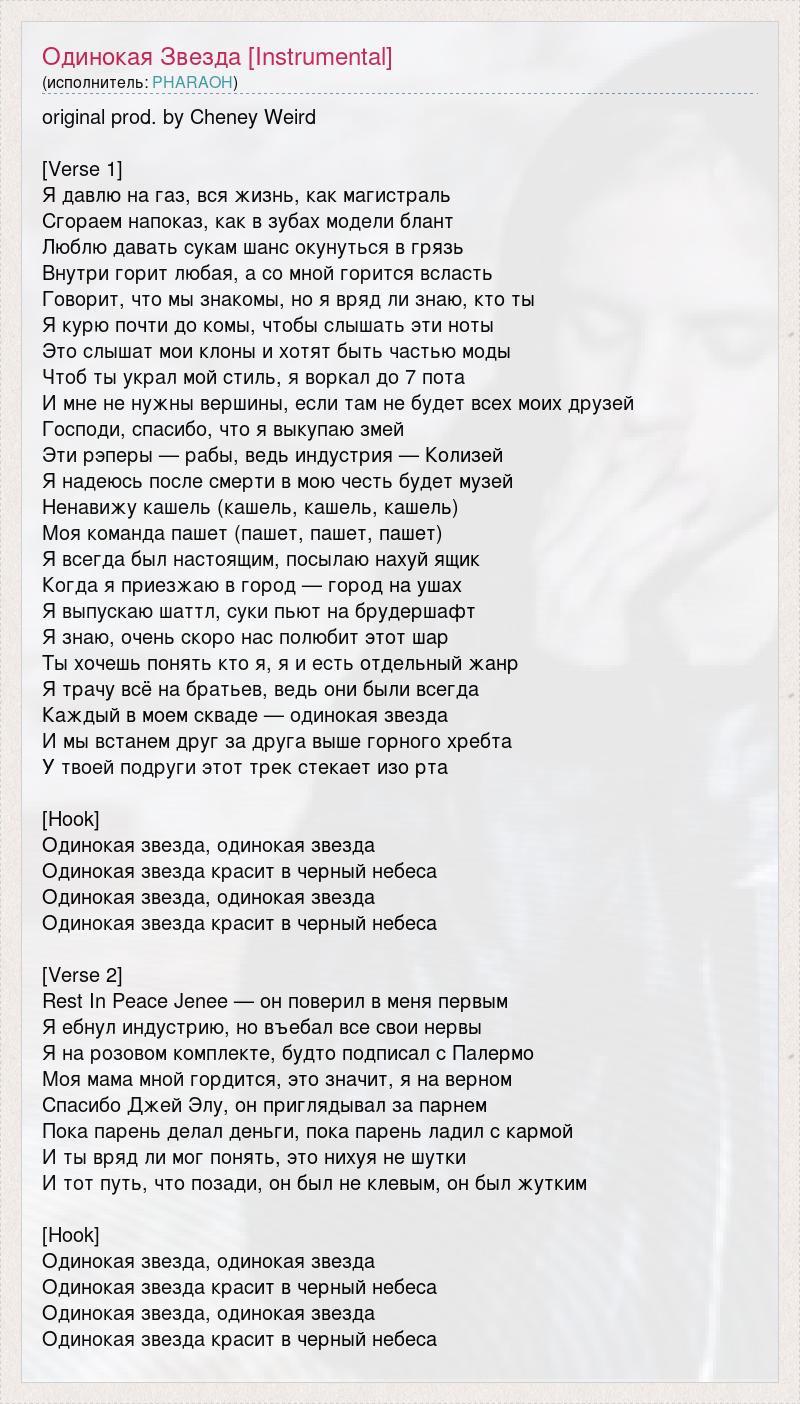 original prod. by Cheney Weird [Verse 1] Я давлю на газ, вся жизнь, как магистраль Сгораем напоказ, как в зубах модели блант Люблю давать сукам шанс окунуться в грязь Внутри горит любая, а со мной горится всласть Говорит, что мы знакомы, но я вряд ли знаю, кто ты Я курю почти до комы, чтобы слышать эти ноты Это слышат мои клоны и хотят быть частью моды Чтоб ты украл мой стиль, я воркал до 7 пота И мне не нужны вершины, если там не будет всех моих друзей Господи, спасибо, что я выкупаю змей Эти рэперы — рабы, ведь индустрия — Колизей Я надеюсь после смерти в мою честь будет музей Ненавижу кашель (кашель, кашель, кашель) Моя команда пашет (пашет, пашет, пашет) Я всегда был настоящим, посылаю нахуй ящик Когда я приезжаю в город — город на ушах Я выпускаю шаттл, суки пьют на брудершафт Я знаю, очень скоро нас полюбит этот шар Ты хочешь понять кто я, я и есть отдельный жанр Я трачу всё на братьев, ведь они были всегда Каждый в моем скваде — одинокая звезда И мы встанем друг за друга выше горного хребта У твоей подруги этот трек стекает изо рта [Hook] Одинокая звезда, одинокая звезда Одинокая звезда красит в черный небеса Одинокая звезда, одинокая звезда Одинокая звезда красит в черный небеса [Verse 2] Rest In Peace Jenee — он поверил в меня первым Я ебнул индустрию, но въебал все свои нервы Я на розовом комплекте, будто подписал с Палермо Моя мама мной гордится, это значит, я на верном Спасибо Джей Элу, он приглядывал за парнем Пока парень делал деньги, пока парень ладил с кармой И ты вряд ли мог понять, это нихуя не шутки И тот путь, что позади, он был не клевым, он был жутким [Hook] Одинокая звезда, одинокая звезда Одинокая звезда красит в черный небеса Одинокая звезда, одинокая звезда Одинокая звезда красит в черный небеса