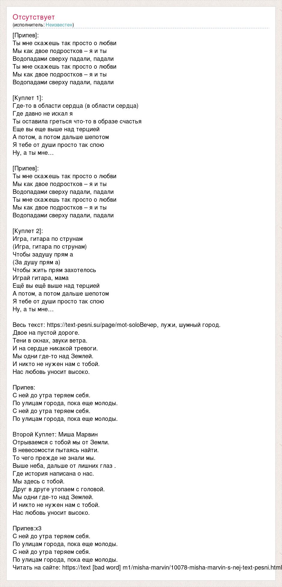 [Припев]: Ты мне скажешь так просто о любви Мы как двое подростков – я и ты Водопадами сверху падали, падали Ты мне скажешь так просто о любви Мы как двое подростков – я и ты Водопадами сверху падали, падали [Куплет 1]: Где-то в области сердца (в области сердца) Где давно не искал я Ты оставила греться что-то в образе счастья Еще вы еще выше над терцией А потом, а потом дальше шепотом Я тебе от души просто так спою Ну, а ты мне… [Припев]: Ты мне скажешь так просто о любви Мы как двое подростков – я и ты Водопадами сверху падали, падали Ты мне скажешь так просто о любви Мы как двое подростков – я и ты Водопадами сверху падали, падали [Куплет 2]: Игра, гитара по струнам (Игра, гитара по струнам) Чтобы задушу прям а (За душу прям а) Чтобы жить прям захотелось Играй гитара, мама Ещё вы ещё выше над терцией А потом, а потом дальше шепотом Я тебе от души просто так спою Ну, а ты мне… Весь текст: https://text-pesni.su/page/mot-soloВечер, лужи, шумный город. Двое на пустой дороге. Тени в окнах, звуки ветра. И на сердце никакой тревоги. Мы одни где-то над Землей. И никто не нужен нам с тобой. Нас любовь уносит высоко. Припев: С ней до утра теряем себя. По улицам города, пока еще молоды. С ней до утра теряем себя. По улицам города, пока еще молоды. Второй Куплет: Миша Марвин Отрываемся с тобой мы от Земли. В невесомости пытаясь найти. То чего прежде не знали мы. Выше неба, дальше от лишних глаз . Где история написана о нас. Мы здесь с тобой. Друг в друге утопаем с головой. Мы одни где-то над Землей. И никто не нужен нам с тобой. Нас любовь уносит высоко. Припев:х3 С ней до утра теряем себя. По улицам города, пока еще молоды. С ней до утра теряем себя. По улицам города, пока еще молоды. Читать на сайте: https://text [bad word] m1/misha-marvin/10078-misha-marvin-s-nej-text-pesni.html