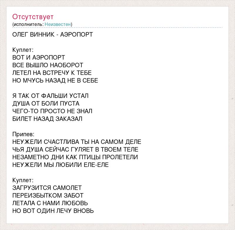 ОЛЕГ ВИННИК - АЭРОПОРТ Куплет: ВОТ И АЭРОПОРТ ВСЕ ВЫШЛО НАОБОРОТ ЛЕТЕЛ НА ВСТРЕЧУ К ТЕБЕ НО МЧУСЬ НАЗАД НЕ В СЕБЕ Я ТАК ОТ ФАЛЬШИ УСТАЛ ДУША ОТ БОЛИ ПУСТА ЧЕГО-ТО ПРОСТО НЕ ЗНАЛ БИЛЕТ НАЗАД ЗАКАЗАЛ Припев: НЕУЖЕЛИ СЧАСТЛИВА ТЫ НА САМОМ ДЕЛЕ ЧЬЯ ДУША СЕЙЧАС ГУЛЯЕТ В ТВОЕМ ТЕЛЕ НЕЗАМЕТНО ДНИ КАК ПТИЦЫ ПРОЛЕТЕЛИ НЕУЖЕЛИ МЫ ЛЮБИЛИ ЕЛЕ-ЕЛЕ Куплет: ЗАГРУЗИТСЯ САМОЛЕТ ПЕРЕИЗБЫТКОМ ЗАБОТ ЛЕТАЛА С НАМИ ЛЮБОВЬ НО ВОТ ОДИН ЛЕЧУ ВНОВЬ
