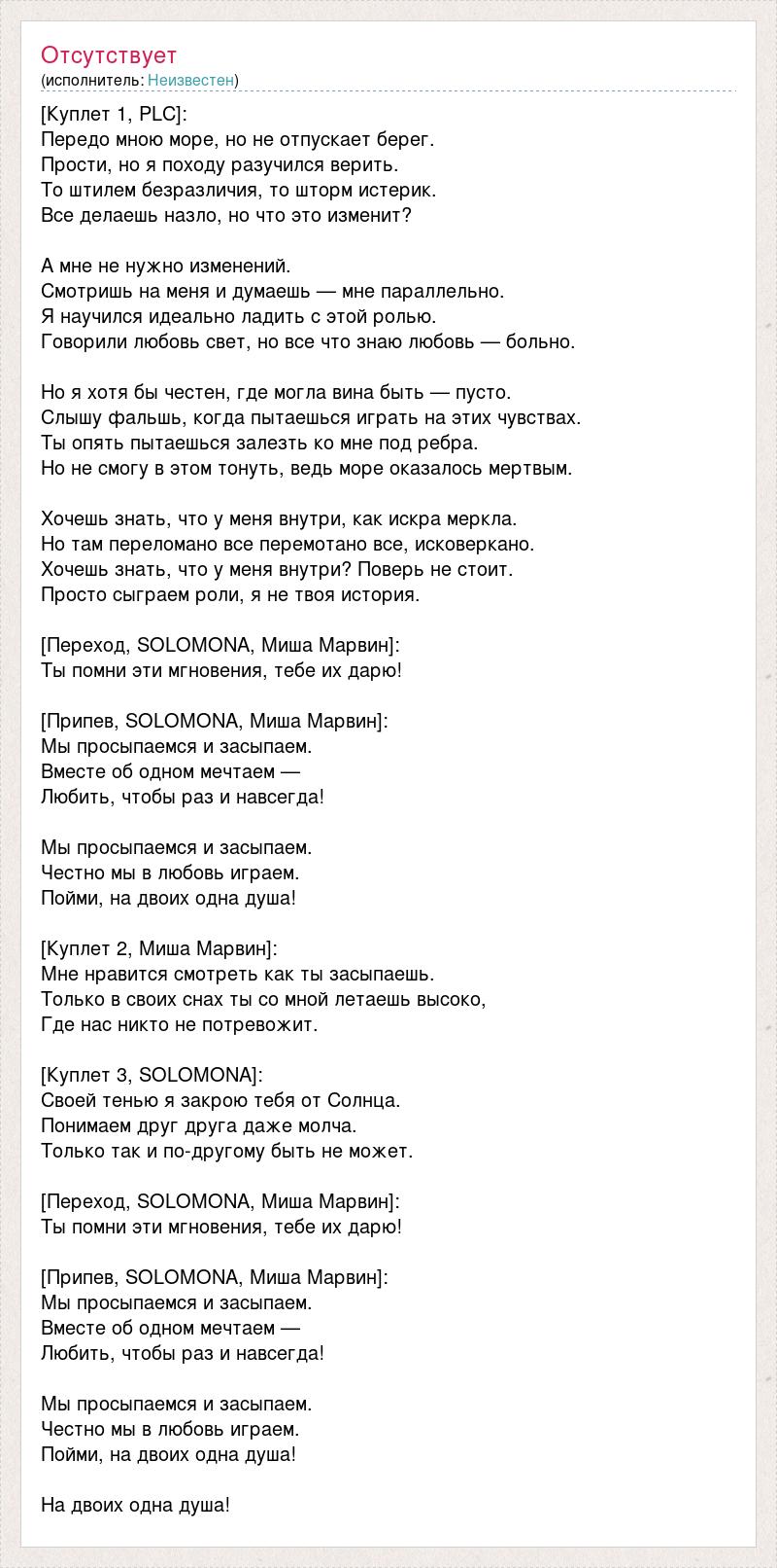 [Куплет 1, PLC]: Передо мною море, но не отпускает берег. Прости, но я походу разучился верить. То штилем безразличия, то шторм истерик. Все делаешь назло, но что это изменит? А мне не нужно изменений. Смотришь на меня и думаешь — мне параллельно. Я научился идеально ладить с этой ролью. Говорили любовь свет, но все что знаю любовь — больно. Но я хотя бы честен, где могла вина быть — пусто. Слышу фальшь, когда пытаешься играть на этих чувствах. Ты опять пытаешься залезть ко мне под ребра. Но не смогу в этом тонуть, ведь море оказалось мертвым. Хочешь знать, что у меня внутри, как искра меркла. Но там переломано все перемотано все, исковеркано. Хочешь знать, что у меня внутри? Поверь не стоит. Просто сыграем роли, я не твоя история. [Переход, SOLOMONA, Миша Марвин]: Ты помни эти мгновения, тебе их дарю! [Припев, SOLOMONA, Миша Марвин]: Мы просыпаемся и засыпаем. Вместе об одном мечтаем — Любить, чтобы раз и навсегда! Мы просыпаемся и засыпаем. Честно мы в любовь играем. Пойми, на двоих одна душа! [Куплет 2, Миша Марвин]: Мне нравится смотреть как ты засыпаешь. Только в своих снах ты со мной летаешь высоко, Где нас никто не потревожит. [Куплет 3, SOLOMONA]: Своей тенью я закрою тебя от Солнца. Понимаем друг друга даже молча. Только так и по-другому быть не может. [Переход, SOLOMONA, Миша Марвин]: Ты помни эти мгновения, тебе их дарю! [Припев, SOLOMONA, Миша Марвин]: Мы просыпаемся и засыпаем. Вместе об одном мечтаем — Любить, чтобы раз и навсегда! Мы просыпаемся и засыпаем. Честно мы в любовь играем. Пойми, на двоих одна душа! На двоих одна душа!
