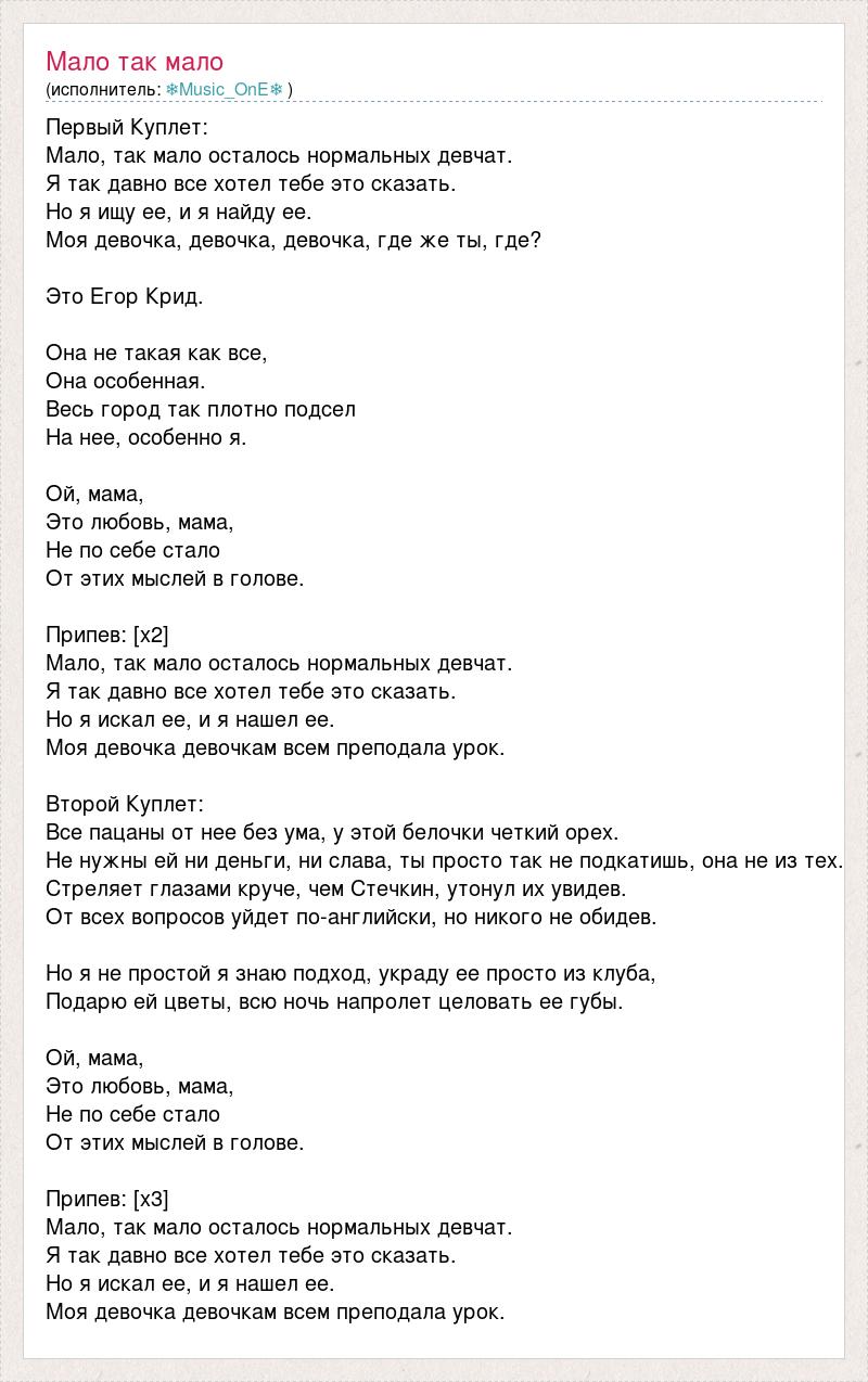 Первый Куплет: Мало, так мало осталось нормальных девчат. Я так давно все хотел тебе это сказать. Но я ищу ее, и я найду ее. Моя девочка, девочка, девочка, где же ты, где? Это Егор Крид. Она не такая как все, Она особенная. Весь город так плотно подсел На нее, особенно я. Ой, мама, Это любовь, мама, Не по себе стало От этих мыслей в голове. Припев: [х2] Мало, так мало осталось нормальных девчат. Я так давно все хотел тебе это сказать. Но я искал ее, и я нашел ее. Моя девочка девочкам всем преподала урок. Второй Куплет: Все пацаны от нее без ума, у этой белочки четкий орех. Не нужны ей ни деньги, ни слава, ты просто так не подкатишь, она не из тех. Стреляет глазами круче, чем Стечкин, утонул их увидев. От всех вопросов уйдет по-английски, но никого не обидев. Но я не простой я знаю подход, украду ее просто из клуба, Подарю ей цветы, всю ночь напролет целовать ее губы. Ой, мама, Это любовь, мама, Не по себе стало От этих мыслей в голове. Припев: [х3] Мало, так мало осталось нормальных девчат. Я так давно все хотел тебе это сказать. Но я искал ее, и я нашел ее. Моя девочка девочкам всем преподала урок.