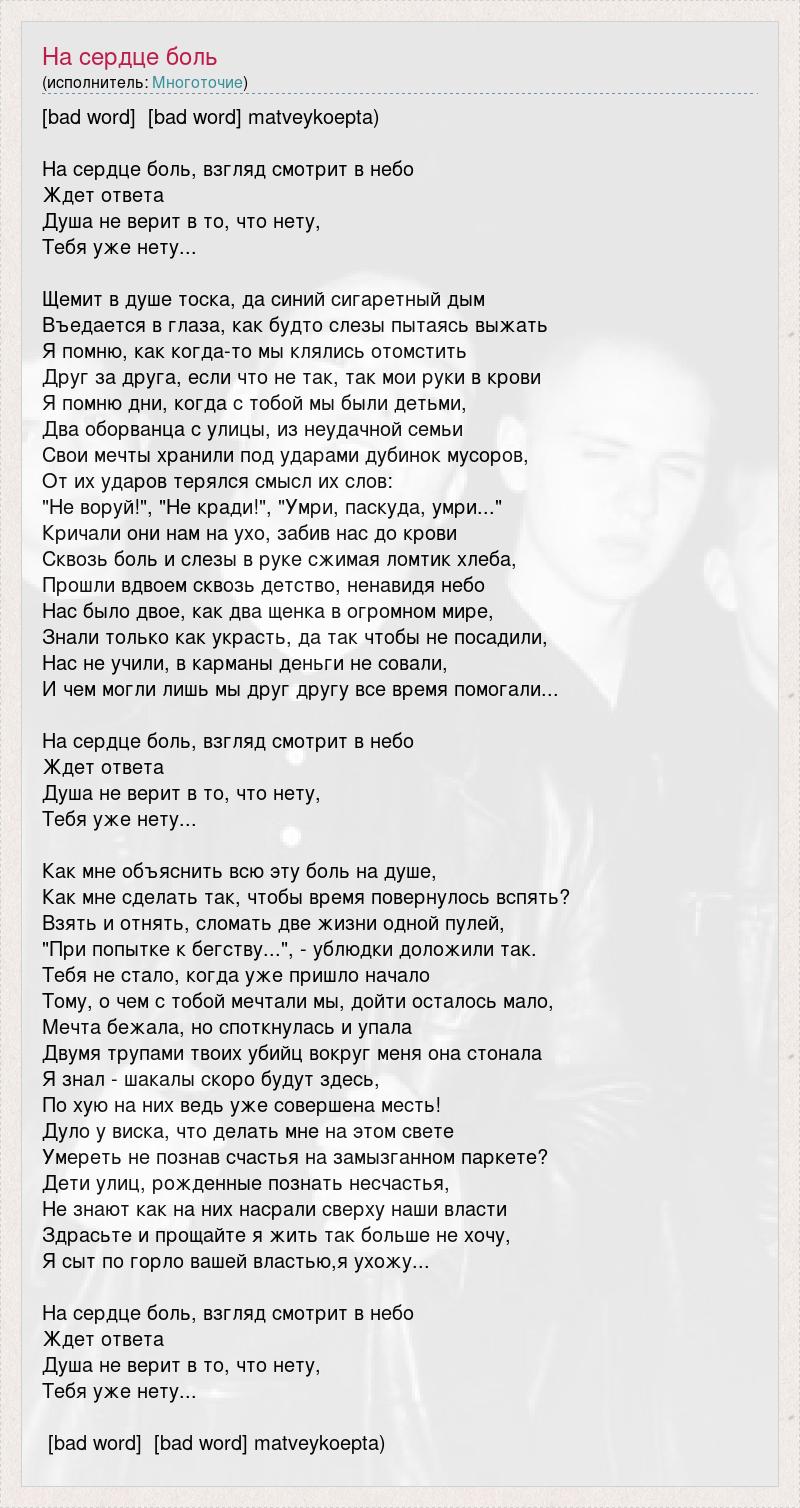 [bad word] [bad word] matveykoepta) На сердце боль, взгляд смотрит в небо Ждет ответа Душа не верит в то, что нету, Тебя уже нету... Щемит в душе тоска, да синий сигаретный дым Въедается в глаза, как будто слезы пытаясь выжать Я помню, как когда-то мы клялись отомстить Друг за друга, если что не так, так мои руки в крови Я помню дни, когда с тобой мы были детьми, Два оборванца с улицы, из неудачной семьи Свои мечты хранили под ударами дубинок мусоров, От их ударов терялся смысл их слов: "Не воруй!", "Не кради!", "Умри, паскуда, умри..." Кричали они нам на ухо, забив нас до крови Сквозь боль и слезы в руке сжимая ломтик хлеба, Прошли вдвоем сквозь детство, ненавидя небо Нас было двое, как два щенка в огромном мире, Знали только как украсть, да так чтобы не посадили, Нас не учили, в карманы деньги не совали, И чем могли лишь мы друг другу все время помогали... На сердце боль, взгляд смотрит в небо Ждет ответа Душа не верит в то, что нету, Тебя уже нету... Как мне объяснить всю эту боль на душе, Как мне сделать так, чтобы время повернулось вспять? Взять и отнять, сломать две жизни одной пулей, "При попытке к бегству...", - ублюдки доложили так. Тебя не стало, когда уже пришло начало Тому, о чем с тобой мечтали мы, дойти осталось мало, Мечта бежала, но споткнулась и упала Двумя трупами твоих убийц вокруг меня она стонала Я знал - шакалы скоро будут здесь, По хую на них ведь уже совершена месть! Дуло у виска, что делать мне на этом свете Умереть не познав счастья на замызганном паркете? Дети улиц, рожденные познать несчастья, Не знают как на них насрали сверху наши власти Здрасьте и прощайте я жить так больше не хочу, Я сыт по горло вашей властью,я ухожу... На сердце боль, взгляд смотрит в небо Ждет ответа Душа не верит в то, что нету, Тебя уже нету... [bad word] [bad word] matveykoepta)